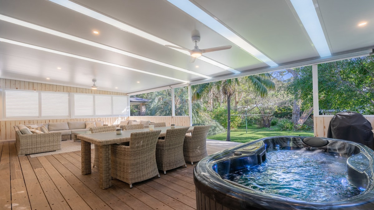 Se aceptan reservas para un máximo de 6 adultos y 8 niños, o hasta 10 adultos. Lujosa casa de 3 dormitorios y 2 baños totalmente renovada con piscina y todas las comodidades nuevas. La cabaña independiente del patio trasero incorpora un dormitorio tamaño king con baño y un gran dormitorio con literas para niños con juegos y televisión inteligente de pantalla grande. Ubicado en amplios y tranquilos jardines totalmente vallados con piscina. Emerald Retreat se encuentra a 400 metros a pie de la mejor playa de la Costa Central. Perfecto para una semana aislada con tu familia.