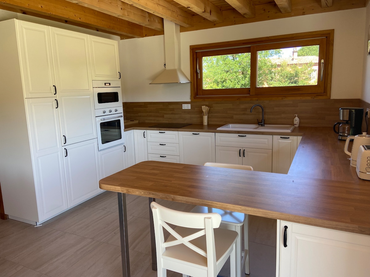 Casa Emye, alma auténtica y lugar con carácter en el corazón de Montpeyroux. Descubra una cocina luminosa que comunica dos acogedores niveles. Cuenta con un baño con una bañera grande y, a continuación, una amplia sala de estar con paredes en bruto, una buena altura del techo, un sofá cama y una zona de dormitorio tranquila. Además, hay una mesa de madera y, por último, una terraza privada para bañarse bajo las estrellas. En el primer piso, cada detalle inspira la serenidad de una suite elegante con proyector de video y ducha para dos.