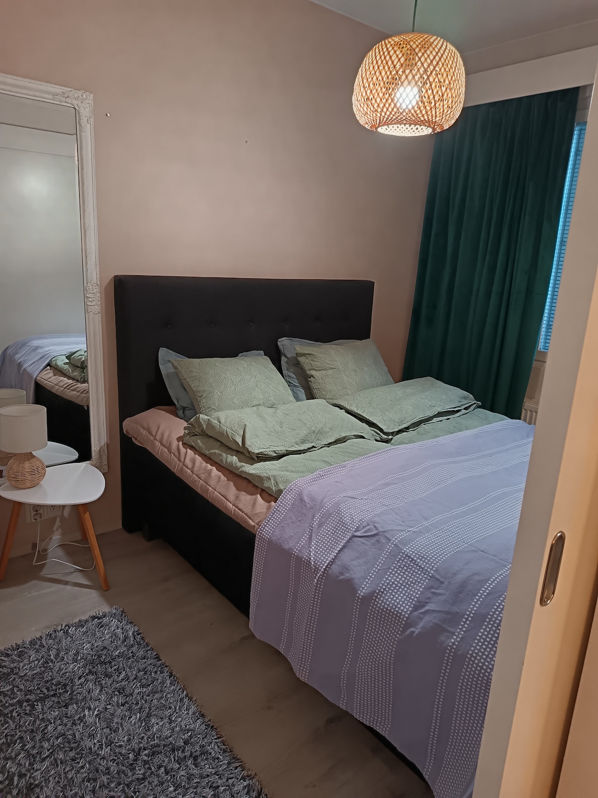 Acogedor apartamento de 1 dormitorio con sauna y estacionamiento gratuito, cerca del centro Acogedor departamento de un dormitorio con sauna privada en una zona tranquila cerca del centro de la ciudad. Dormitorio flexible (doble o dos individuales) más sofá cama. Cocina totalmente equipada, lavavajillas, lavadora, secadora y wifi gratuito. Pisos cálidos y llegada autónoma fácil con caja de llaves. Estacionamiento privado con toma de calefacción incluida.