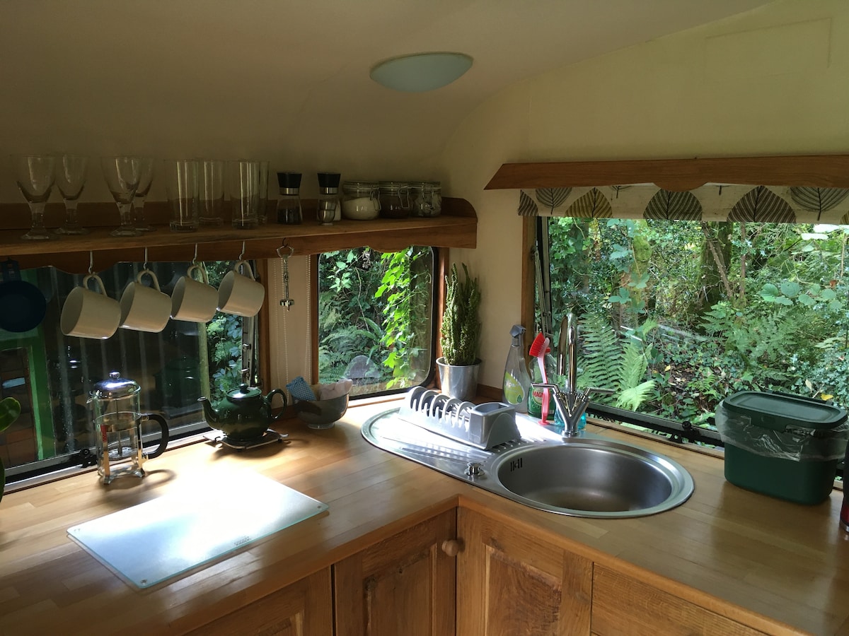 Ubicado en un hermoso jardín privado dentro de un terreno idílico de 3 acres, nuestro romántico escondite combina el encanto vintage con todas las comodidades modernas, desde calefacción por suelo radiante hasta cafetera estilo Nespresso y banda ancha de fibra. * Cama tamaño king * Cocina compacta pero bien equipada * Gran baño privado adyacente * Barbacoa y brasero (madera gratis) * Sauna, estanque natural para nadar (depende de la lluvia), kayaks, sala de juegos, hamaca * Paseos por la colina en la puerta, impresionantes playas y paseos por los acantilados cercanos * Se admite 1 perro.
