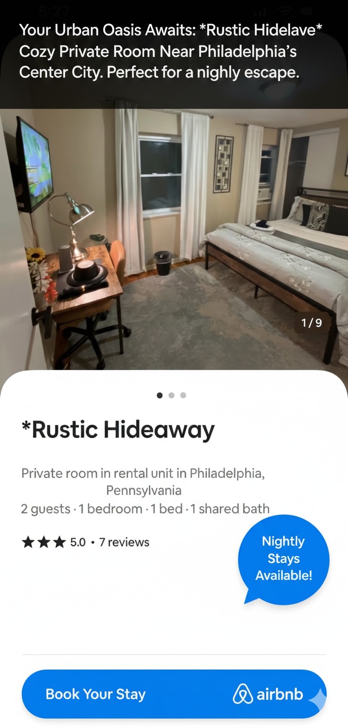 🚫 NOTA IMPORTANTE: ¡EL HUÉSPED PRINCIPAL DEBE TENER MÁS DE 23 AÑOS Y PRESENTAR UNA IDENTIFICACIÓN VÁLIDA AL MOMENTO DE LA RESERVA! No reserves si planeas organizar una fiesta. Se aplica una multa de $ 2000. ✨ Características: • 2 televisores de 65pulgadas + 1 televisor de 40 pulgadas • Wifi ⚡ de alta velocidad. • 🧺 Lavadora/secadora en el alojamiento • 🍳 Cocina con horno y microondas • 🔐 Check-in sin contacto • Unidad 🏡 privada en un edificio de 2 unidades. 📍 Cerca de: • 🎤 The Met (0.5 millas) • 🚇 Broad St. Subway (3 cuadras) • 🏛️ Museo de Arte y Escaleras de Rocky (10 minutos)