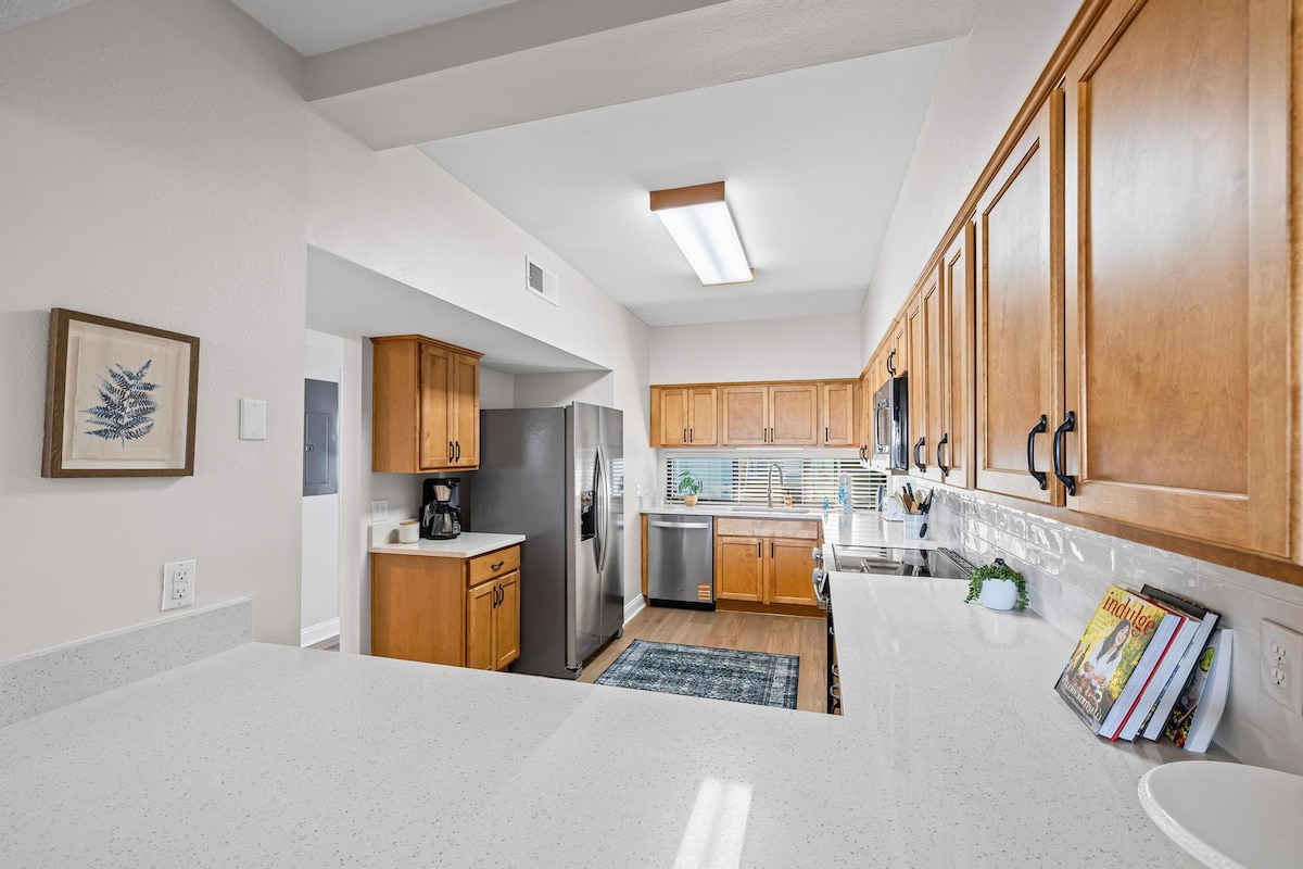Este renovado condominio de 2 camas/1,5 baños está abastecido y listo para ir-- ¡Solo trae tus comestibles y trajes de baño! Este pequeño y pintoresco apartamento en la playa es la escapada perfecta y asequible que estás buscando. En menos de dos minutos a pie de la puerta de entrada, puedes tener los pies en la arena, tomando el sol en el golfo. Cuenta con una cochera para estacionamiento privado, dos dormitorios, w/a cama king en una habitación, dos camas dobles en la otra, un sofá en la sala de estar y un colchón de aire queen.