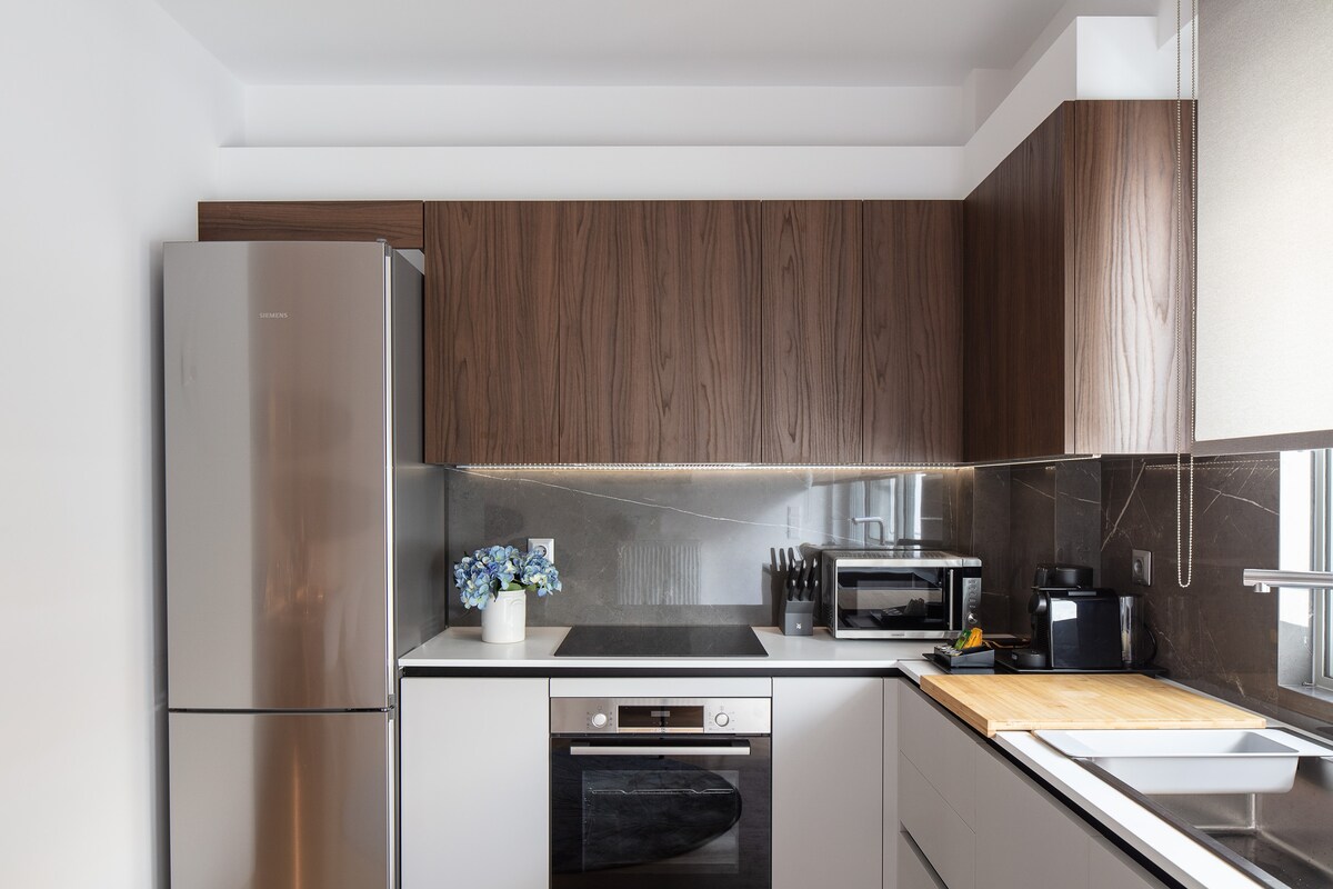 Disfruta de un nuevo apartamento (2021) tranquilo y céntrico en el distrito de negocios de Marousi con vistas a la naturaleza y aparcamiento gratuito cerca de hospitales (Ygeia, Mhtera, Centro Médico de Atenas y Iaso), el Estadio Olímpico OAKA de Atenas, a poca distancia a pie del centro comercial Golden Hall, restaurantes, supermercado y metro Kifisias.
