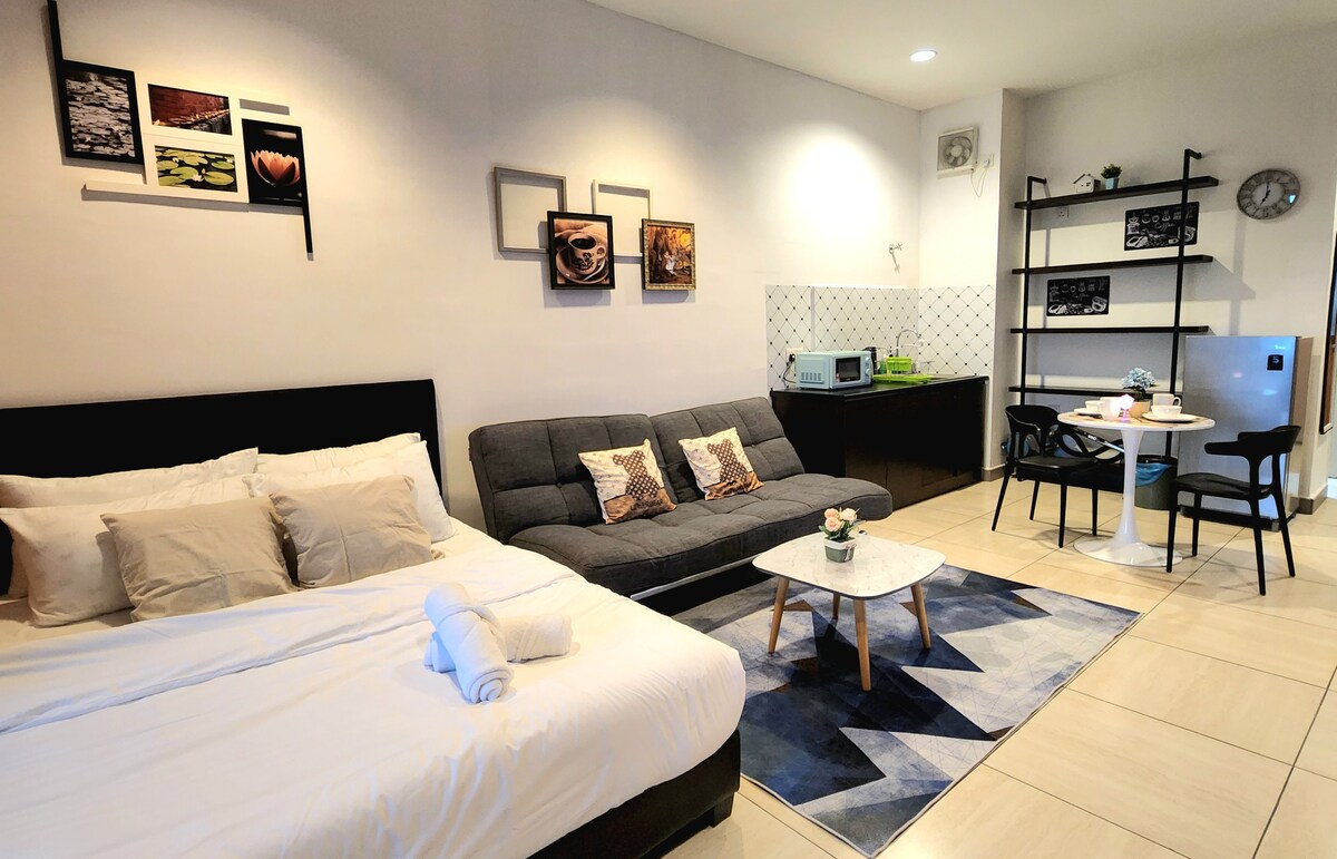 Elegante apartamento en la ciudad con wifi rápido, paquete completo de Astro, Netflix y Disney+. Disfruta de acceso a piscinas, gimnasios y un jardín en la azotea. Ubicado en el centro, cerca del centro comercial AEON, el cine TGV y restaurantes. ¡Experiméntalo tú mismo!