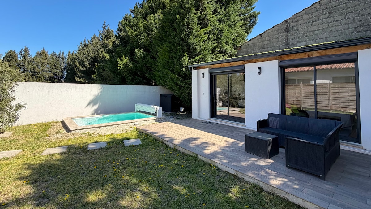 En un entorno verde, villa típica provenzal completamente renovada y decorada con cuidado. Tiene una sala de estar muy grande con zona de estar con billar y comedor, 2 dormitorios con armario empotrado, 1 baño con ducha y lavabos dobles, secador de pelo. 1 cocina totalmente equipada (horno, placa, microondas, lavavajillas, lavadora, hervidor de agua, cafetera). Pérgola,plancha, jardín, piscina, bicicletas, mesa de ping pong ... Estacionamientos gratuitos y seguros