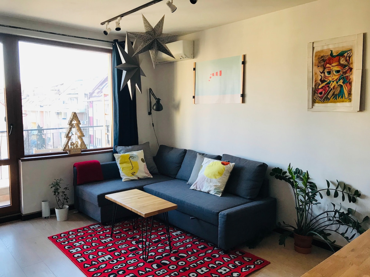 Cozy apartment on Buxton Brothers Blvd. A busy area where you will find numerous restaurants, bakeries, shops and public transport stops .It is less than 20 minutes from the center by public transport, you also have connection with the tram and metro. The apartment has a beautiful view of Vitosha. It is pet friendly. It has a sofa bed in the living room with capacity for two people. In the other room there is a double bed with a totally awesome home office corner for those working from home.