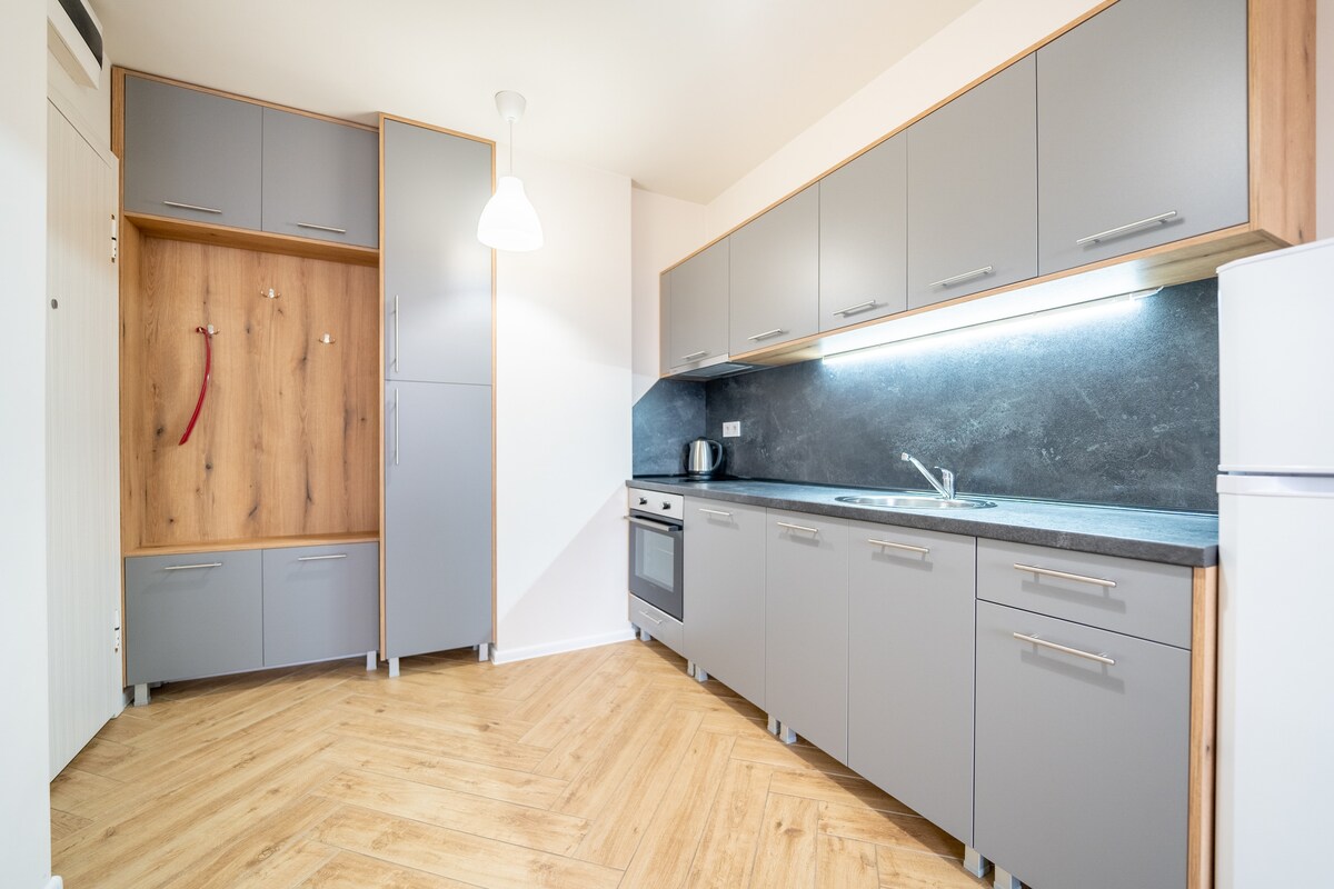 Apartamento a estrenar en 2022, ubicado a 5 minutos a pie de la Nueva Universidad Búlgara. Cuenta con todo lo necesario para tu estancia a corto o largo plazo: cama tamaño king, comedor, baño moderno con inodoro, cocina totalmente equipada, armario con perchas, wifi, TV, etc. Es perfecto para una escapada romántica, viajes de negocios, viajeros solos, estudiantes y todos los que disfrutan de diseños modernos combinados con comodidad y un ambiente tranquilo.