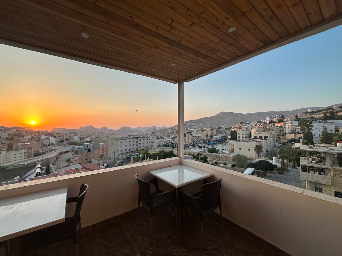 (( ofrecemos transporte gratuito a Petra)) Tómate un descanso y relájate en este tranquilo lugar. Esta habitación doble con cama tiene baño privado, todo muy limpio, no muy lejos del centro de visitantes de Petra, está a unos 2 km, también a 1,5 km del centro de la ciudad... hay una gran vista de las montañas de Petra y también hay una sala de estar en la azotea donde puedes disfrutar del desayuno y la cena también, la vista también es increíble mientras estás en la parte superior del edificio.