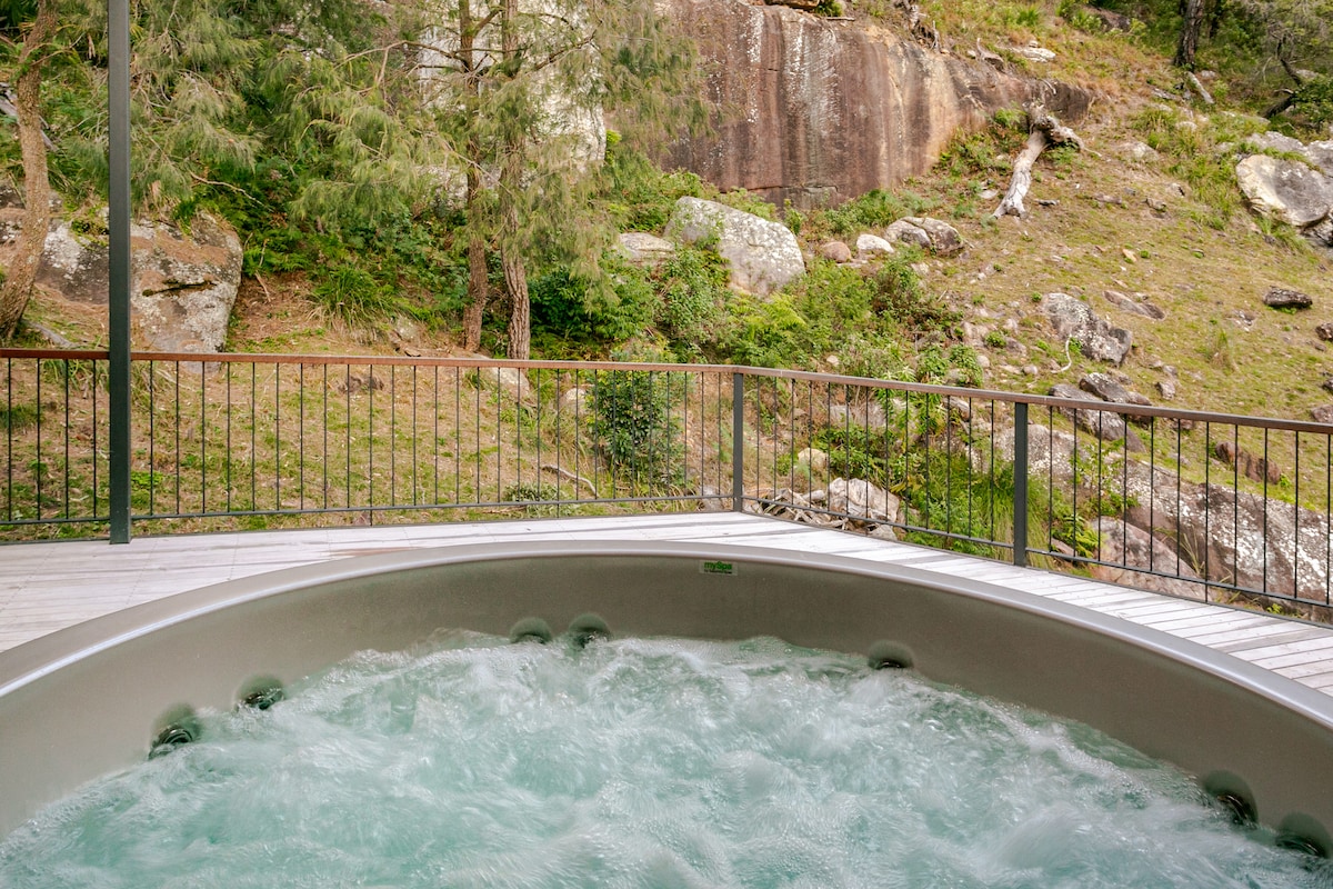 This purpose-built small space is perched in the prettiest spot on a private 25 acre property. With stunning views, an inviting outdoor hot tub and luxurious furnishings, you won’t want to leave. Nurture your soul & pare back to nature with a splash of luxury & comfort. With all the mod cons you could wish for & strategically placed in the most peaceful natural setting you could imagine. Easy access, drive to the front door, no 4WD required.