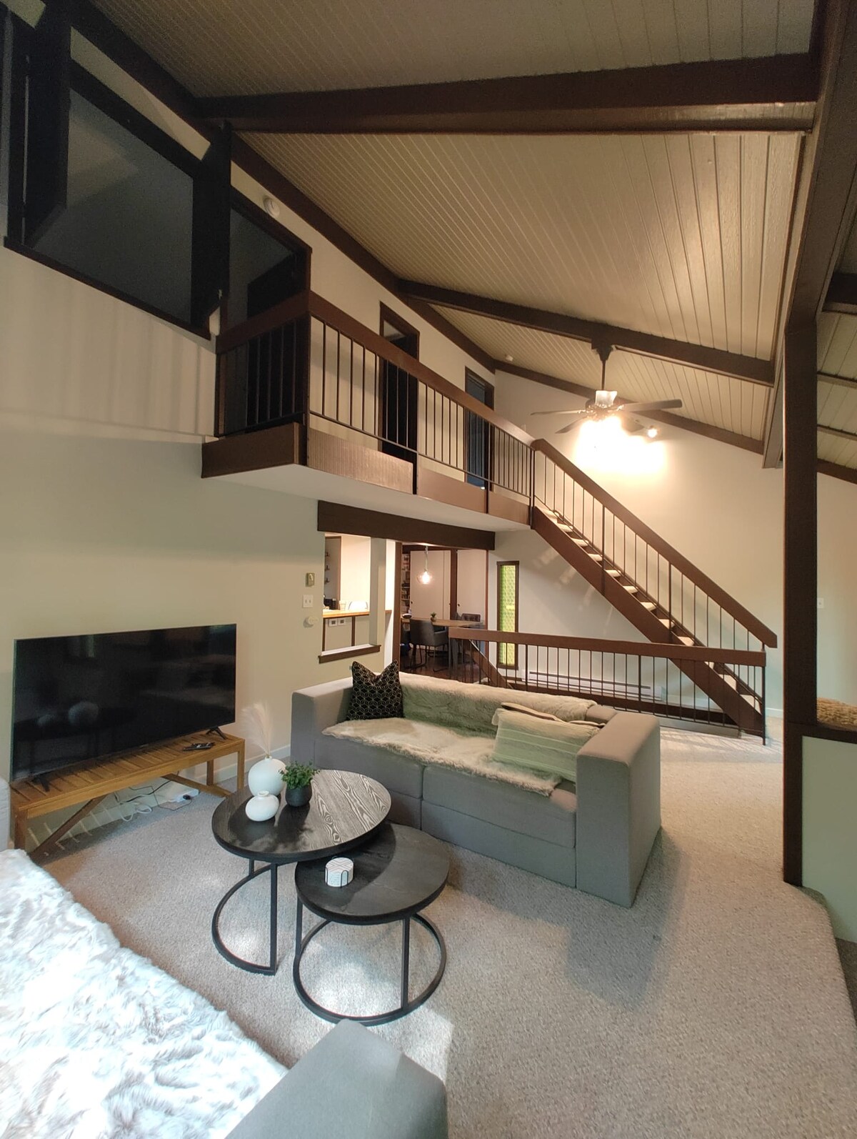 ¡POR FAVOR, LÉELO! Mt. St. Louis y Horseshoe Valley a la vuelta de la esquina! Esta es una SUITE DE INVITADOS luminosa, grande y privada (apartamento en el sótano). Bañera de hidromasaje, patio, chimenea y sendero aislado en el bosque para disfrutar de la naturaleza. La cocina está equipada con una placa de inducción y todas las cosas necesarias, incluso un abridor de botellas de vino :) Sala de estar/cocina/comedor de concepto abierto con TV y Roku. El dormitorio es una obra de arte: ¡oscuro, misterioso y romántico! Cama tamaño queen personalizada hecha de madera de granero desgastada recuperada de nuestra propiedad.