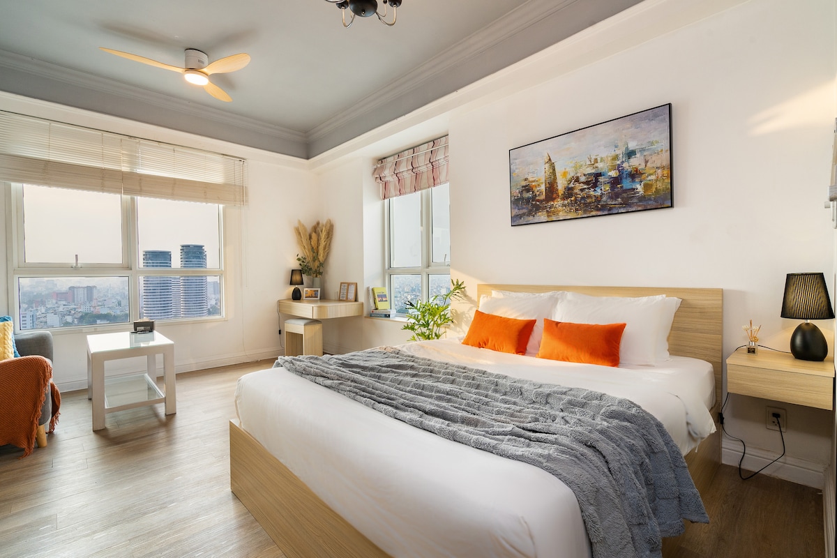 Amplio apartamento de 2 dormitorios, reformado con estilo y amueblado con una hermosa vista al barrio circundante y a la ciudad. Totalmente equipado con una amplia gama de servicios (ver fotos) inigualables por otros apartamentos de la ciudad, servicio al cliente rápido hasta tarde. Alojarse con nosotros es la mejor opción para los huéspedes que valoran la confiabilidad y la comodidad. Situado en Vinhomes Central Park, una zona de alta gama con restaurantes, cafeterías, un centro comercial y la famosa torre Landmark 81. A solo 10-15 minutos del centro de la ciudad.