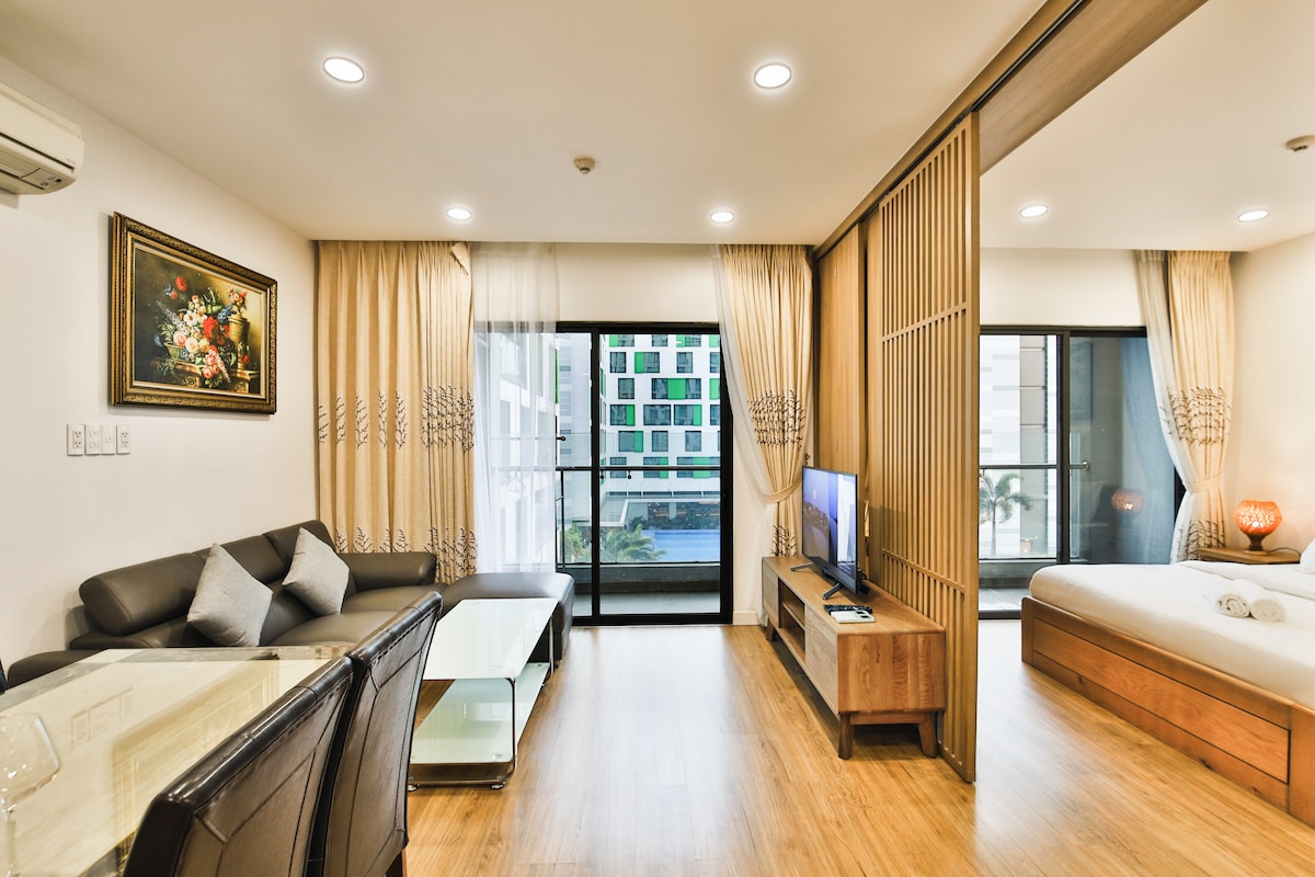 Estudio coreano de mediados de siglo lleno de sol junto al aeropuerto de Tan Son Nhat. Perfecto para vuelos tempranos y estancias relajantes con registro automático. • Vista de la pista de aterrizaje de aviones de "un millón de dólares": observa cómo despegan los aviones desde las ventanas del piso al techo. • Ascensor grande: transporte de equipaje fácil. • Cine: TV inteligente de 55 pulgadas sobre ruedas. • Relajación: balcón y aromaterapia. • Gratis: minibar (fideos/café) y estacionamiento (1 bicicleta). ✨Ubicación dorada: camina hasta la Terminal 3. A solo 5-10 minutos de las terminales nacionales e internacionales.