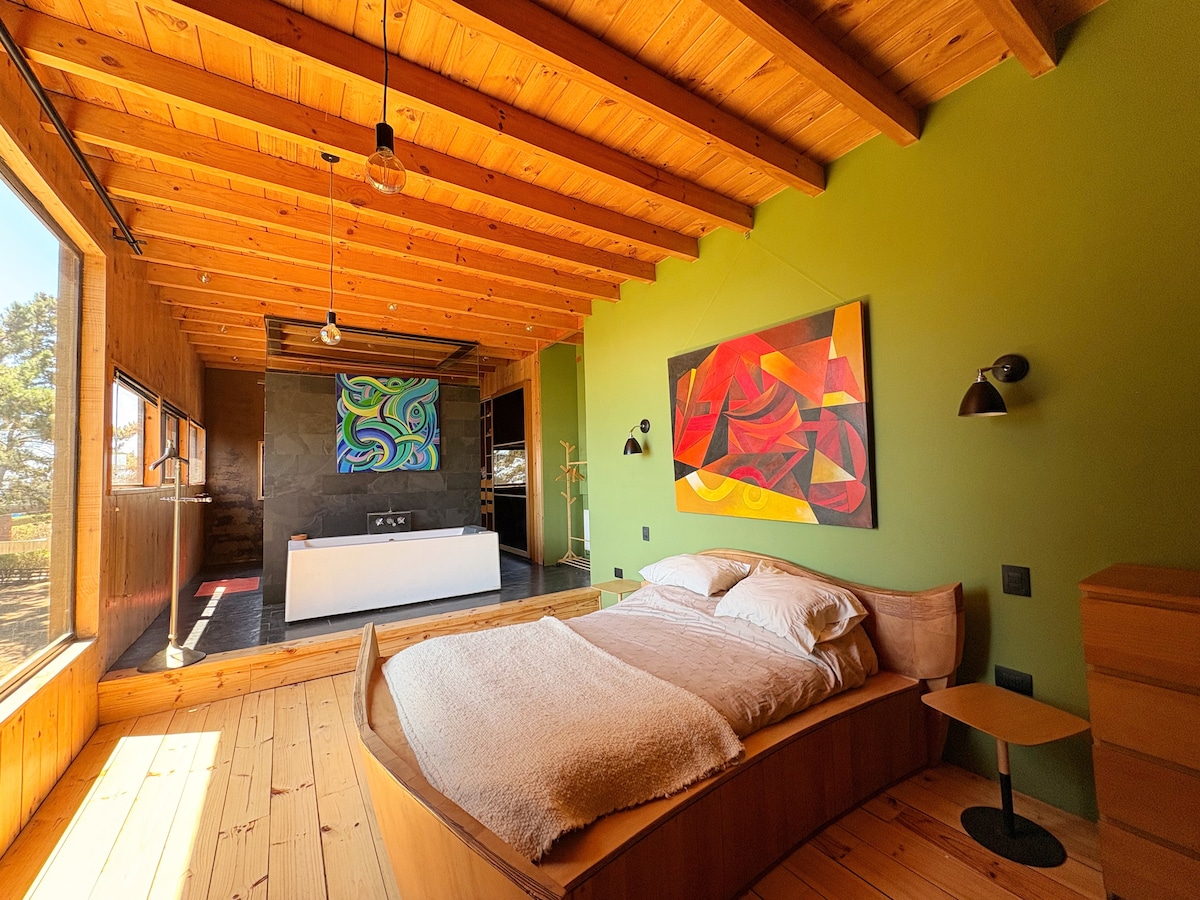 Cabaña de madera con tinaja y starlink en medio de la naturaleza, con increíbles vistas a la laguna de cáhuil y a una quebrada de bosque nativo. Este mágico lugar está bien conectado con las principales atracciones de la zona, pero a la vez retirado lo justo y necesario para disfrutar del silencio del bosque. Tiene terrazas para tomar sol, hot tub, rampa de skate, fogón, parrilla a gas y a leña. Full señal celular y wifi