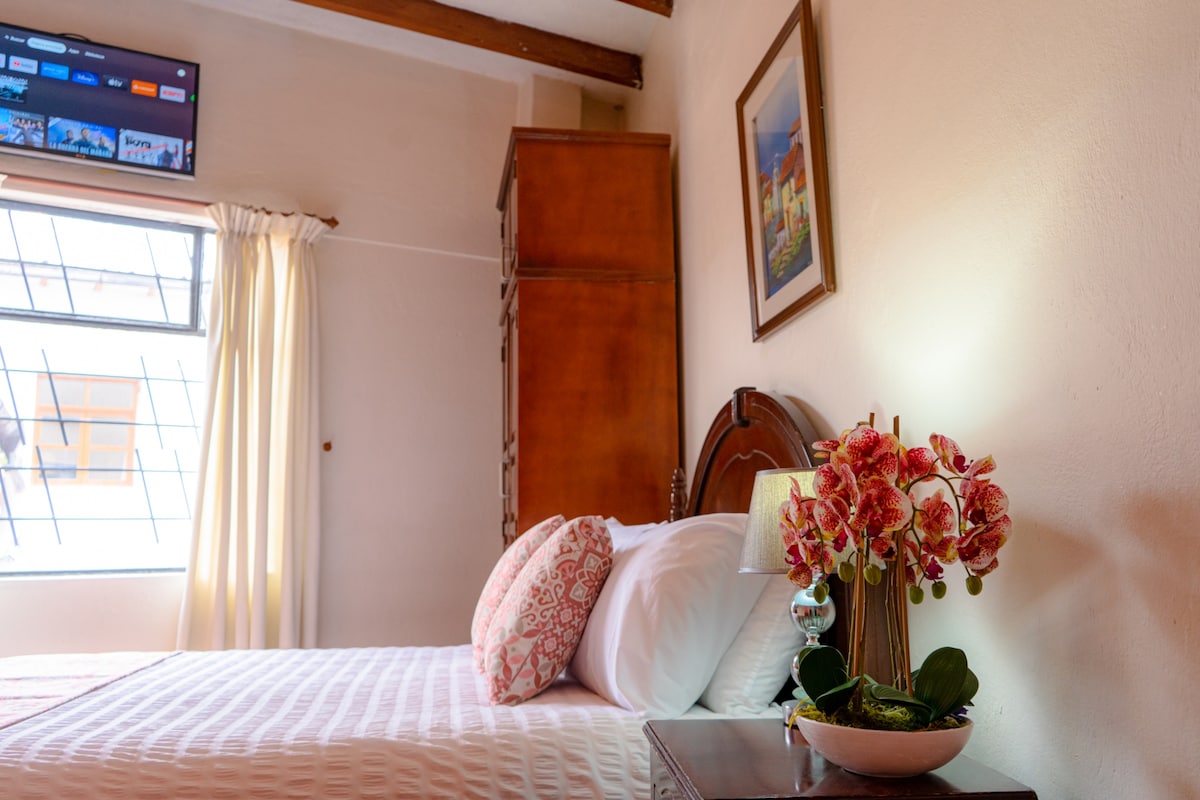 Ubicados en el Centro Histórico de Quito 🏛️, nuestro hotel familiar ofrece una experiencia única en una casa neoclásica restaurada. La habitación, ideal para 2 a 4 personas, cuenta con una cama Queen y dos camas Twin, baño privado con agua caliente, TV de pantalla plana, WiFi y desayuno incluido. Su balcón privado ofrece vistas espectaculares a la Basílica y al Panecillo, además de un mural pintado por artistas de la Escuela Quiteña.