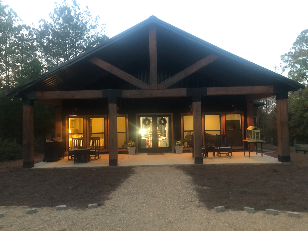 Take a break and unwind at this peaceful barndominium oasis between Tuscaloosa AL and Columbus MS on 40 acres. Totally private (no curtains because not needed) with your own small spring fed lake. new gas range, cook's kitchen, Starlink, Hulu. Sleeps 2 ideally in queen bed, additional futon if needed. New home, premium bedding. Tankless HOT water. Huge front porch and also screened porch on side with additional OUTDOOR SHOWER. Board games, hammock, firepit, fishing gear.