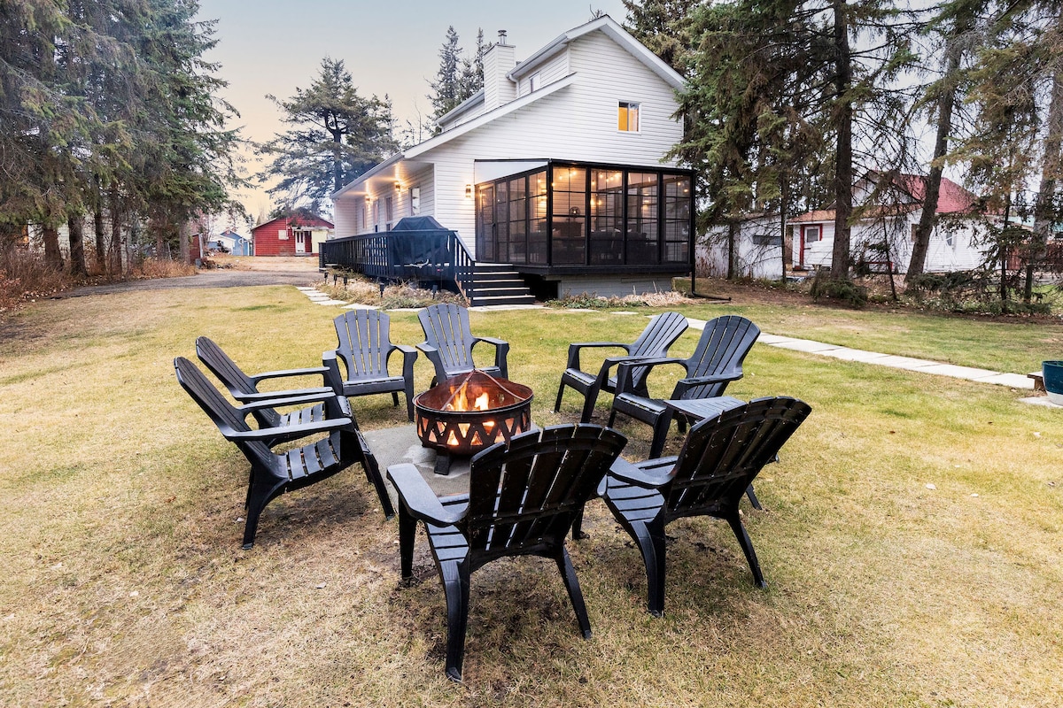 MaMeO Beach Getaway on Pigeon Lake Fantastic for girls weekend, 2 families vacation or multi-generational family getaway - 1 block to premier white sand MaMeO beach on Pigeon Lake - 5 mins drive to the Village at Pigeon Lake - 4 bedrooms - 2 king beds - 1 queen bed - 2 twin beds - 2 bathrooms - Soaker tub - Walk-in rain shower - Dining table seats 8 - Screened in Deck, with ample comfy seating - Record player - BBQ & firepit - Wood-burning fire