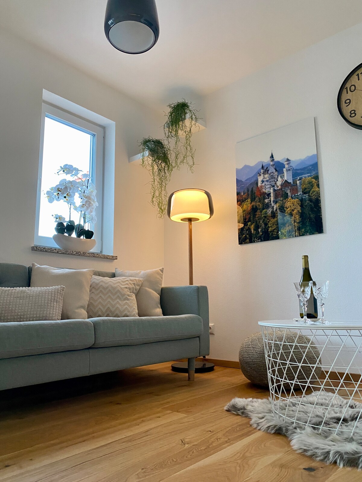 pure.erholung - die Seele baumeln lassen, frische Bergluft einatmen, die Natur unter den Füßen spüren, einfach sein! Das helle Apartment bietet von zwei Balkonen spektakuläre Aussichten auf die Alpen sowie das Schloß Neuschwanstein. Es liegt direkt am Forggensee (Stausee). The bright apartment is about 100 sq.m. in size. The two generously sized balconies offer breathtaking views of the Alps as well as of the famous castle “Neuschwanstein”. It´s located right next to the dam Forggensee.