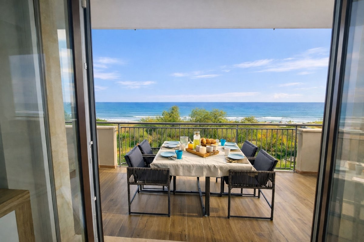 Está ubicado en el segundo piso de un edificio (sin ascensor). El departamento es un dúplex. Al entrar hay un dormitorio doble con balcón con vistas al mar y un baño con ducha. En el piso superior se encuentra la cocina y un pequeño área para dormir con una cama individual en un área. Pequeña terraza con vistas al mar.