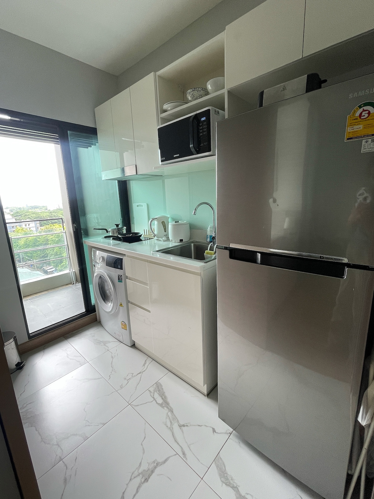 Cama 🛏️ tamaño king (1,8 m) con sábanas importadas y colchón de látex para un sueño cómodo. Baño 🚿 completo con ducha, champú, gel de baño y secador de pelo. Balcón 🌿 privado con mesa y sillas. Cargador rápido de⚡ 40 W y plancha. Wifi de alta velocidad de📶 500 M. Televisión 📺 inteligente, compatible con Netflix para tu propia cuenta. 👕 Lavadora y secadora, balcón para secar. Cocina 🍳 abierta con nevera, microondas, estufa, hervidor y tostadora.