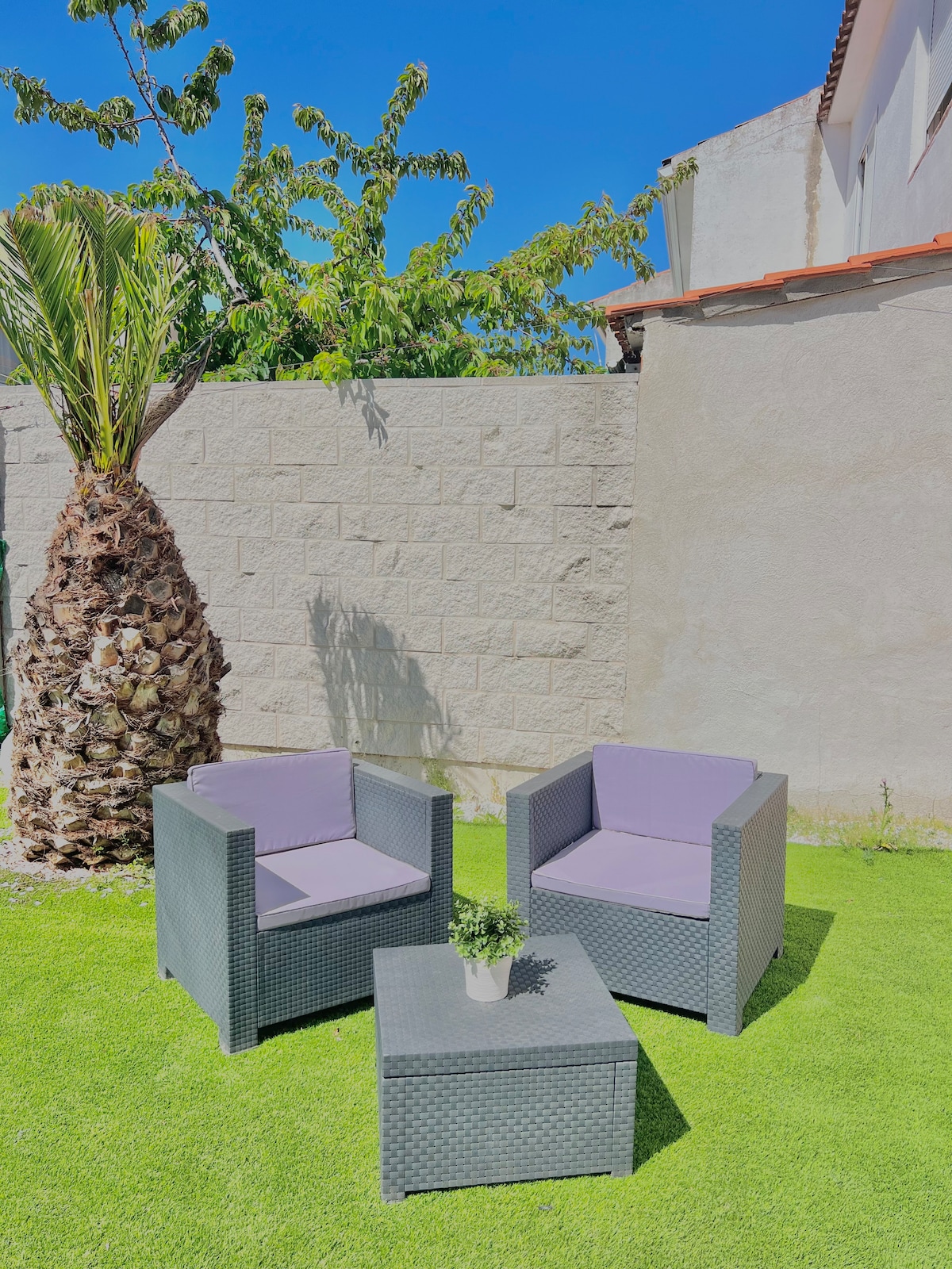 Acogedora casita cerca de la capital, en una zona tranquila y segura, con amplio jardín. Tiene habitación con cama doble, sofá-cama individual y baño completo, otra habitación con cama doble, salón con sofá-cama doble, otro baño completo, cocina y amplio jardín con barbacoa, zona para comer, zona de juegos y sitio para aparcar. Transporte público a escasos metros para llegar a la capital, comercios y zona de ocio cercana. Posibles ruidos de lun a vie por colegio y obras cercanas