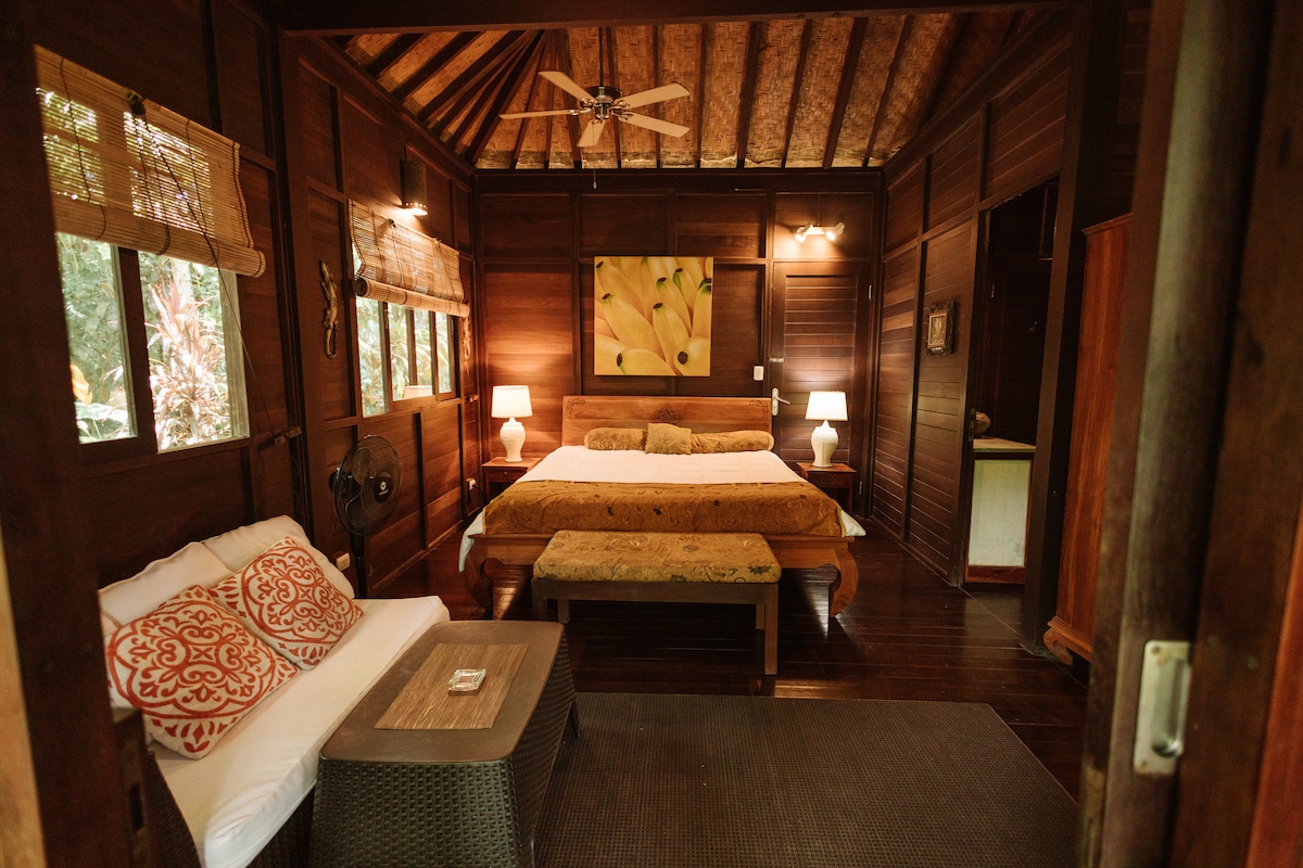 Ubicada en lo alto de los árboles, esta romántica casa de dos pisos de estilo balinés ofrece impresionantes vistas de Isla Ballena, Isla Caño y la península de Osa. Relájate en el baño al aire libre con un baño caliente bajo las estrellas o un refrescante chapuzón frío rodeado de sonidos de la selva. Privado pero cerca de la ciudad, es el refugio perfecto para parejas que buscan conexión, naturaleza y un toque de magia. Diseñado para parejas que buscan algo verdaderamente especial, el alojamiento te invita a reducir la velocidad y conectarte con la naturaleza y entre sí.