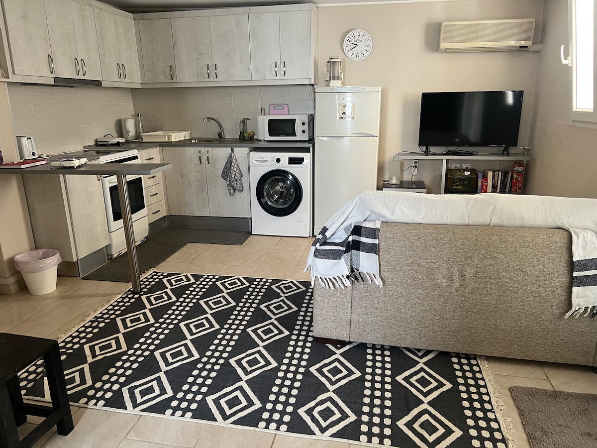 Un pequeño ático, de unos 30 metros cuadrados, con una cama doble con sofá doble, mesa de comedor, nevera, kitchenette, limpio y cómodo, muy adecuado para parejas, con una terraza privada extra grande para disfrutar del cálido sol griego, lo único es que mi lugar está en el quinto piso, mientras que el ascensor solo llega al cuarto piso, por lo que subir un piso a pie