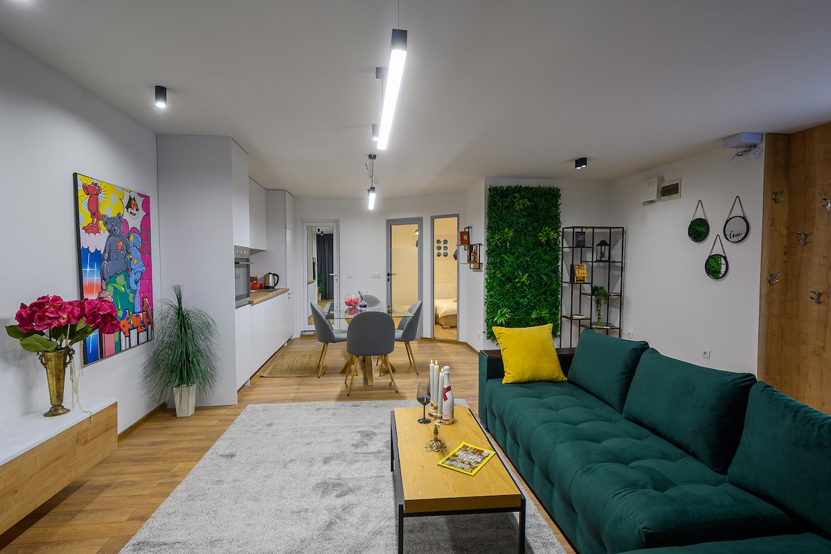 Apartamento de lujo, situado en el corazón de Bansko, en la calle principal, justo al lado del remonte principal. El departamento es de 70 m2 y ofrece las vacaciones perfectas para una familia/grupo de amigos de hasta 4. EL apartamento: - Una gran sala de estar de espacio abierto con cocina totalmente equipada, mesa de comedor, sofá cómodo y grande (opción de cama completa), TV, Internet de alta velocidad, vistas muy bonitas de la ciudad y las montañas. - Dormitorio espacioso, con cama cómoda, armario grande y TV. - Baño moderno y grande.