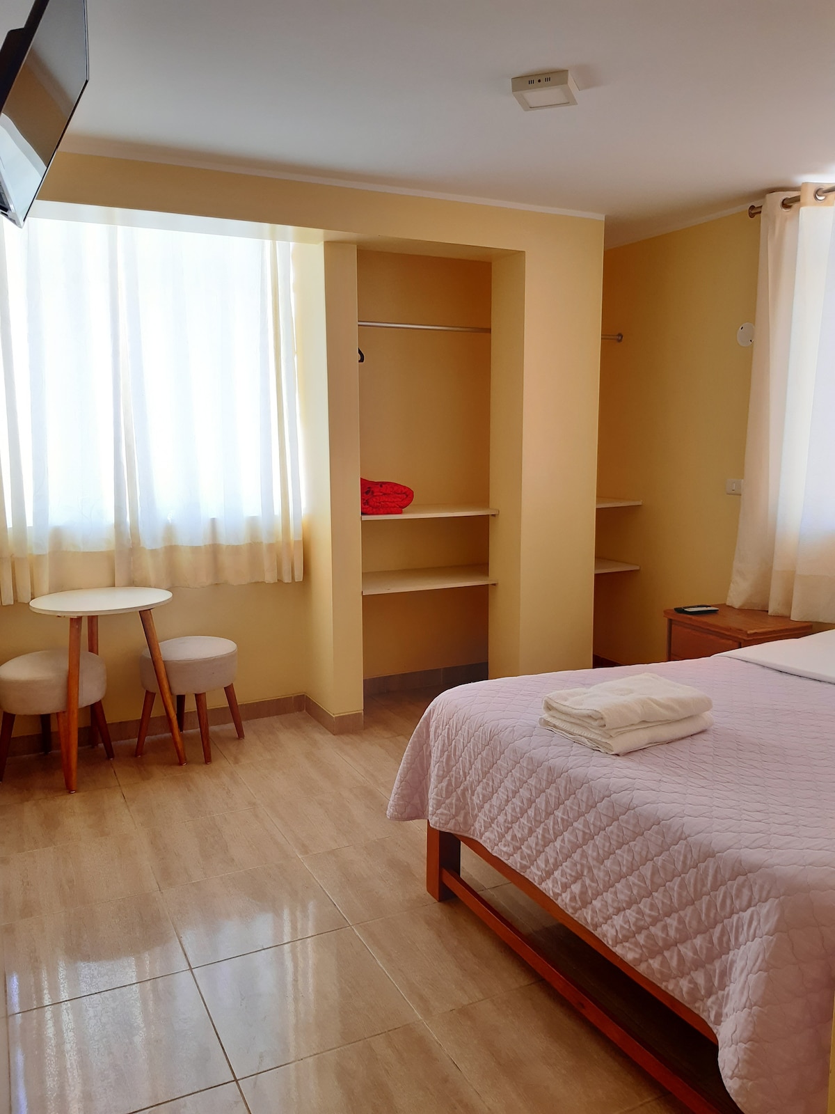 Hotel acogedor y agradable con servicio de cafetería y una deliciosa y variada pasteleria de toda ocasion . Estamos a solo 10 min de paracas y a 100 mt del aeropuerto de pisco , hacemos las conexiones para los tours en la reserva ,las Islas ballestas etc , todo a la mano y con seguridad, son habitaciones matrimoniales para 2 personas y también contamos con habitaciones dobles que se pueden acceder previo pago adicional , el precio sube un 50 % en días feriados o festivos del año