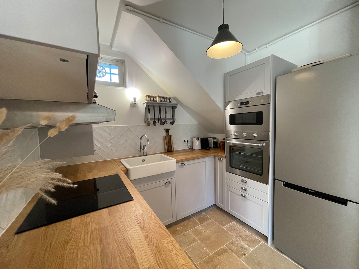 Disfrute de nuestro estudio con balcón orientado al sur y bañera de hidromasaje en la Marina. Está equipado con una cama real de 160x200 con sábanas de lino, Wifi, TV conectada, cocina equipada con lavavajillas, cafetera de granos orgánicos con molinillo, té orgánico y sodastream, 1 botella de sidra local fresca de regalo, Wifi. Relajación asegurada en el baño equipado con una bañera de hidromasaje para una persona. Los inodoros están separados. El estacionamiento gratuito está al lado del edificio.
