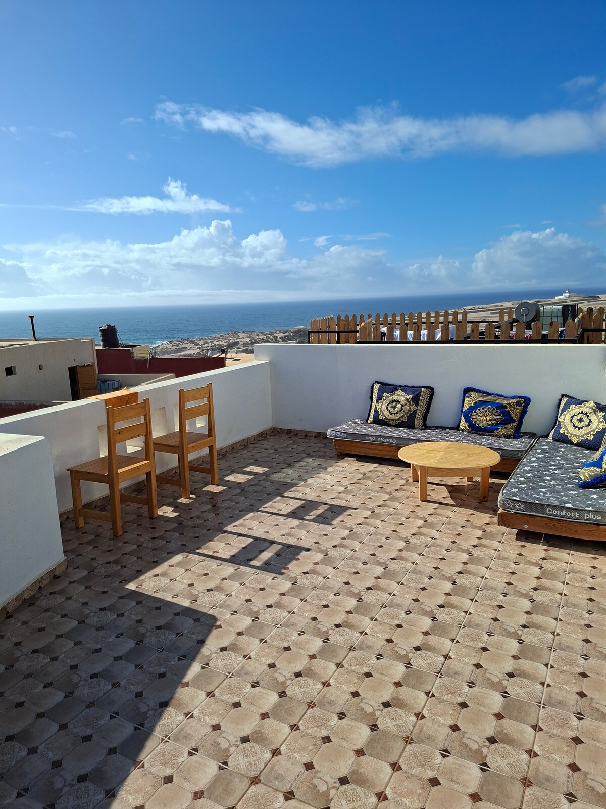Ubicada en el vibrante y colorido pueblo de Aghroud, Rosyplage es una joya frente a la playa que ofrece impresionantes vistas al mar desde cada habitación. Planta baja: estudio totalmente equipado. El primer piso se siente como estar en un barco con un salón marroquí y un televisor listo para Netflix de 75 pulgadas. Dos dormitorios orientados al mar te esperan arriba. Nivel superior: cocina que conduce a una terraza, seguida de un solárium bañado por el sol ideal para hacer yoga y puestas de sol. Las comodidades modernas se encuentran con el encanto de la costa. Nota: la casa tiene 4 niveles y muchas escaleras no son adecuadas para niños pequeños.