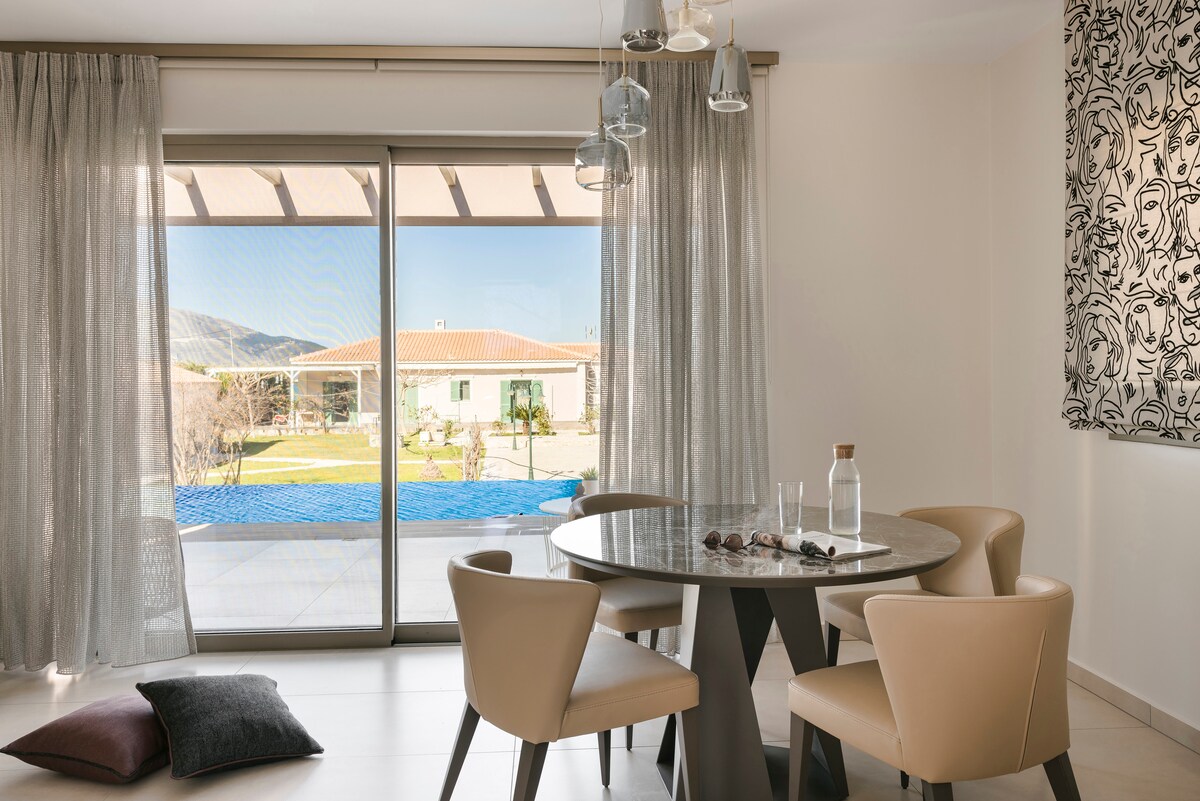 Una casa de nueva construcción abre sus puertas este año, por primera vez para dar la bienvenida incluso a los huéspedes más exigentes. La privacidad que ofrece la villa junto con la arquitectura que combina lo moderno con la decoración minimalista, en combinación con los espacios cómodos y la impresionante fachada con vistas al azul infinito del mar Jónico, lo convierten en un lugar acogedor y encantador. ¡Disfruta de tu estancia en este espacio relajante y elegante!