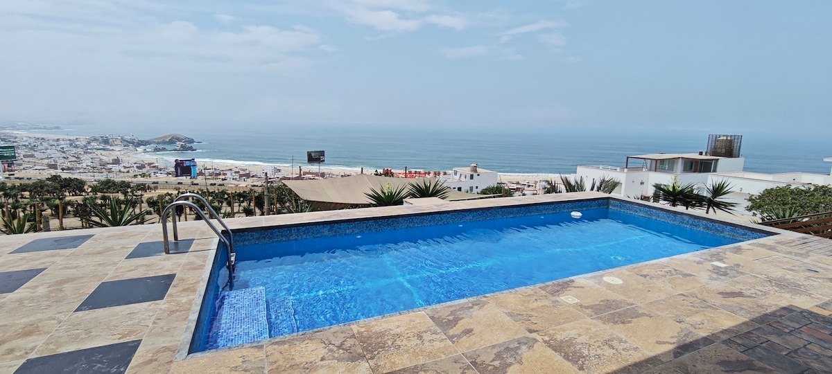 Linda casa de playa pet-lover a 30min de Lima (Punta Negra), maravillosa vista al mar, silencio garantizado sin vecinos a 200m, ideal para reuniones familiares/amigos hasta 2am. 504 m2 en un condo privado, moderna, para familias grandes, a 5-10 min de la playa, 4 dormitorios, 12 camas y 5 baños. Cochera techada 6 autos, amplias terrazas, piscina 11m x 3m para bebes, niños y adultos, múltiples áreas de reuniones con SmartTV, amplia cocina, parrilla, bar y WiFi. Soporte 24h x 7d ES/EN.