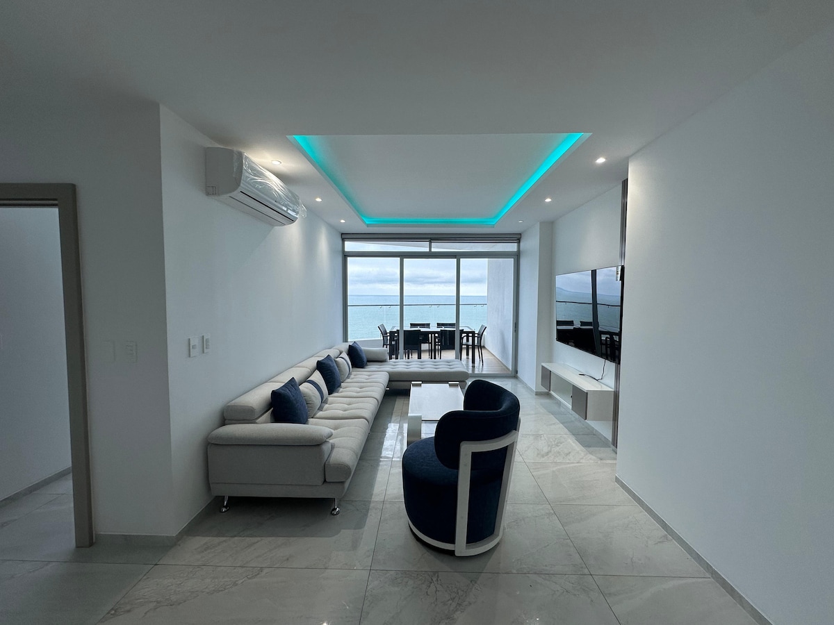 Departamento de lujo frente al mar, perfecto para parejas, familias o grupos que buscan relajarse en un entorno exclusivo junto al mar. Está completamente amueblado, equipado con electrodomésticos de alta gama. Cuenta con un amplio balcón con tina de hidromasaje y vista directa a la playa. Tiene dos habitaciones: una con cama King size y otra con dos literas y una cama adicional. Incluye acceso a tres elevadores y un espacio en el estacionamiento privado.