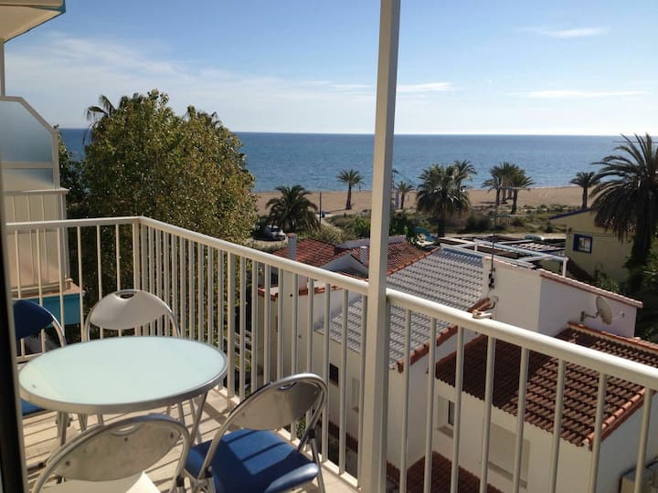 Apartamento con aire acondicionado con ubicación privilegiada junto al mar con acceso directo a la playa.agradable, luminoso con balcón y magnífica vista para comer, disfrutar del aire marino y de los espléndidos amaneceres .Gratis: wifi-parking coche - 2 bicicletas y accesorios de playa .Cocina equipada. A 10 minutos a pie del centro de la ciudad, de su vida nocturna, restaurante, tienda y de la Marina ,punto de partida para los ferrys Ibiza - Formentera y todas las demás excursiones de un día. Supermercado cerca