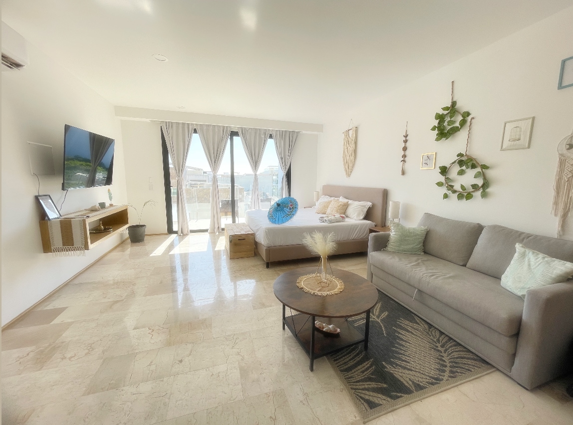 Hermoso departamento estilo estudio, totalmente equipado y con cama king-size. El residencial cuenta con una variedad de amenidades como dos albercas, gimnasio, camas balinesas y una increíble galería de arte con diferentes exposiciones cada mes. El departamento es ideal para descansar y disfrutar de una de las mejores ubicaciones en Playa del Carmen. El internet es de alta velocidad y permite trabajar remotamente.