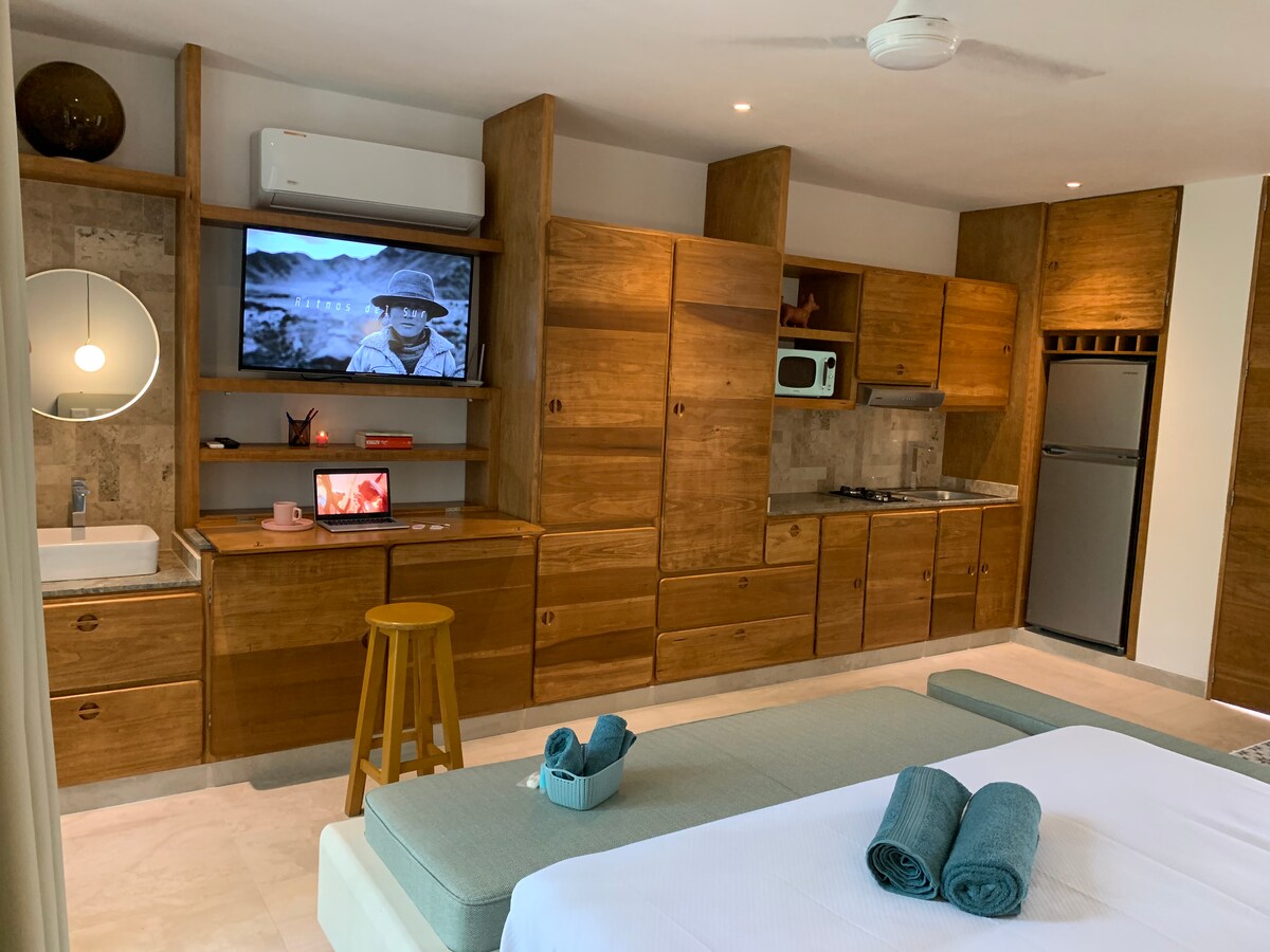 El estudio esta equipado con una cocineta equipada, una Smart tv, una cama matrimonial, un comedor, una pequeña sala de estar. También cuenta con una terraza y plantas de la región, Es un zona tranquila y segura y esta ubicada cerca de Plazas comerciales, Farmacias, restaurantes. El alojamiento se ubica a 10 minutos del Acceso a la Playa y de la 5ta avenida caminando. Existen diferentes medios de transporte como el taxi, servicio colectivo publico, los cuales se toman a 50 metros.