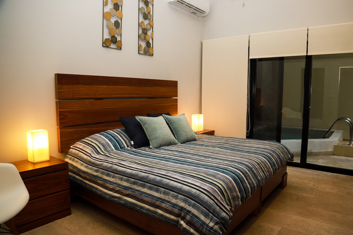 Luxury one bedroom condo with private terrace and plunge pool . Modern space fully equiped to ensure a comfortable and relaxing stay in Playa. Enjoy also common amenities including pool, gym and business center. Exclusivo departamento de una recamara con terraza y alberca privada. Espacio moderno completamente equipado para asegurar una estadía cómoda y relajante en Playa. Disfruta también areas comunes incluyendo piscina ,gimnasio y business center.