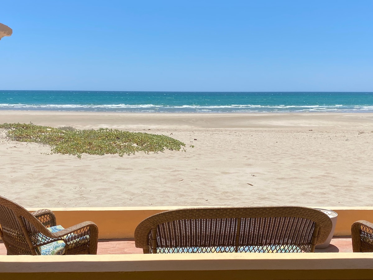 BELLEZA TRANQUILA FRENTE A LA PLAYA... ¿Buscas unas vacaciones tranquilas, relajantes o románticas lejos de las multitudes? Ubicado en la playa más prístina de toda la comunidad de Rocky Point. Si practicar surf de remo, esnórquel, buscar objetos en la playa o ver el amanecer o la puesta de sol desde tu propio patio privado es tu elección, entonces te sentirás como en casa. Comunidad cerrada con seguridad las 24 horas, 7 días a la semana. Servicios completos, Direct TV, wifi, ropa de cama limpia y todo lo que necesites.