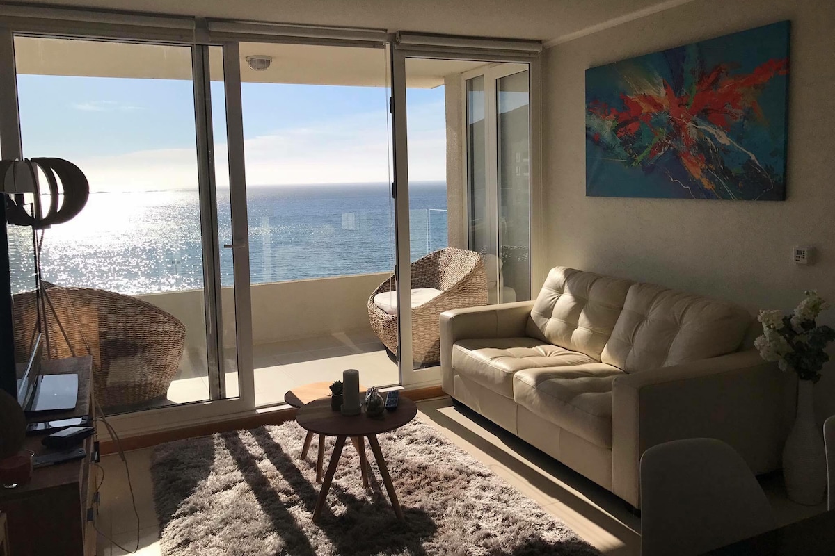 Hermoso Dpto.3 dorm. 2 baños y 1 estacionamiento en primera linea frente al mar con una hermosa vista despejada a toda la bahía. Depto. mejor ubicado del edificio. Full equipado con todas las comodidades, WiFi, Cocina, horno, refrigerador, Smart TVs, cable, parlante Bluetooth, 1 cama 2 pzas, 1 cama 1 pza, 2 camas 1.5 pzas. Piscina, ascensor y acceso controlado. No incluye sabanas ni toallas. No se aceptan mascotas. Prohibido Fumar. Opción Sabanas y toallas de ducha por $40.000.- adicional