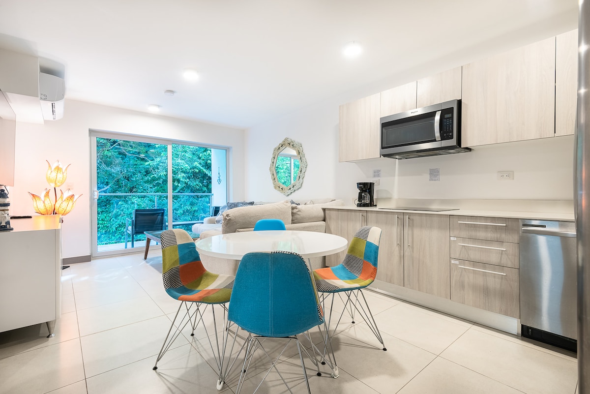 Relax with the whole family at this peaceful place to stay. Enjoy the calm of he nature surrounded by beautiful trees and birds. Just few steps from the beach. Punta Esmeralda is located within the well-known Punta Leona complex. The building is brand new and the apartment ready to go. It has free access to Playa Mantas and the Punta Esmeralda Beach Club with its 3 pools, 2 jacuzzi and an exceptional lounge and solarium area. The parking lot is super safe in front of the building.