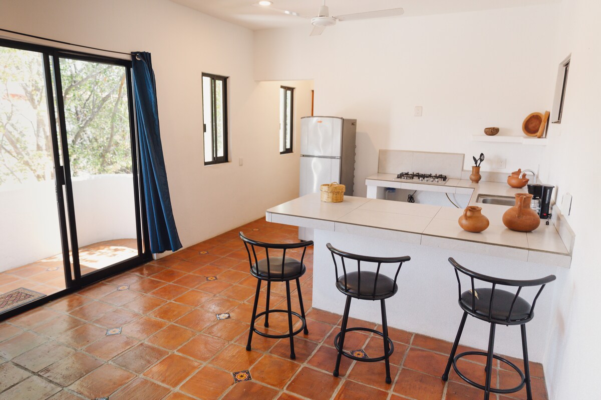 Estudio privado rodeado de naturaleza donde disfrutaras de tranquilas y estrelladas noches. La habitación es completamente Independiente, agua caliente, cama Queen size Cuenta con cafetera, frigobar, licuadora, parrilla y los utensilios necesarios para poder tomar un desayuno o cena sencillos. Tambien cuenta con area especial afuera donde podras lavar trastes y poner a secar las toallas Es de muy facil acceso a trasporte publico y a nos encontramos a10 minutos del centro de Puerto Escondido
