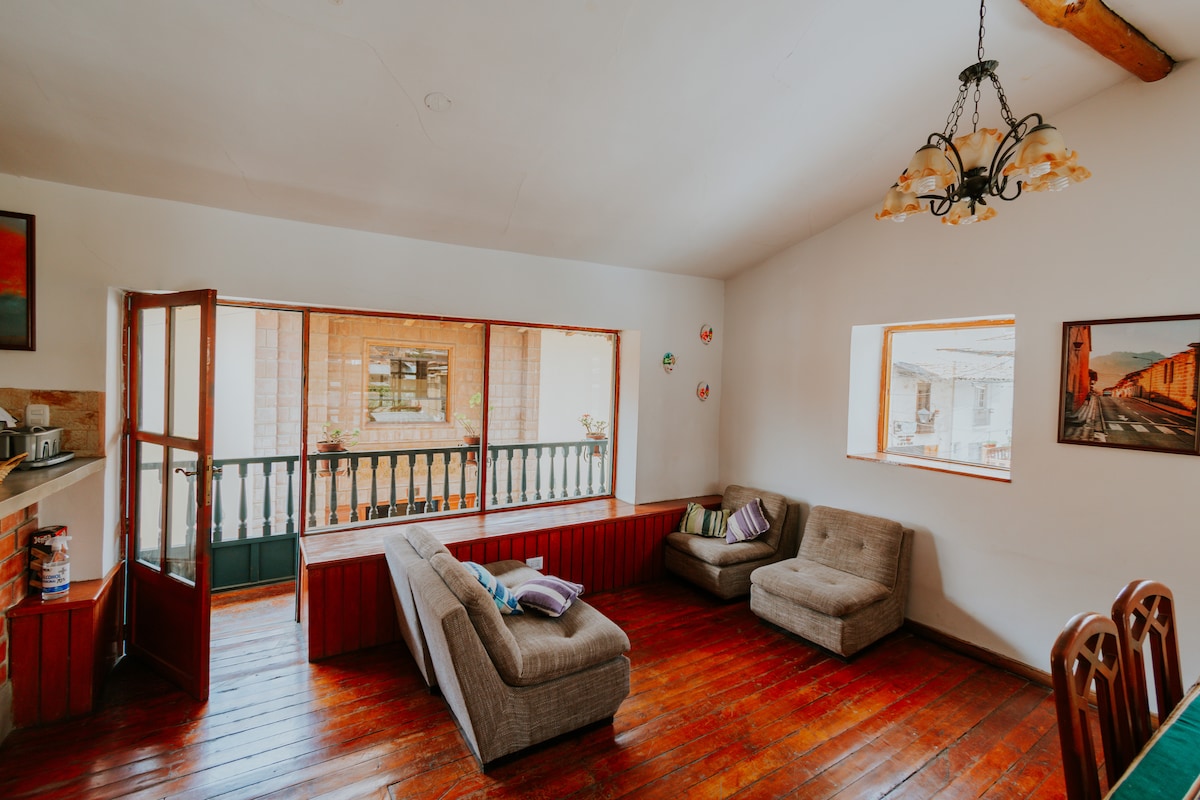 Amplio apartamento en el 3er piso de una casona junto a la Plaza de Armas de Cajamarca. Cuenta con 3 habitaciones privadas, todas con baño propio, agua caliente, TV Smart, WIFI, toallas y ropa de cama de algodón pima. Una de las habitaciones tiene cama de 2 plazas y vista a la Plaza; otra con 1 cama de 2 plazas y 1 de plaza y media; y otra con 1 cama de 2 plazas y 2 de plaza y media. Incluye sala, cocina, comedor y balcón exclusivos.