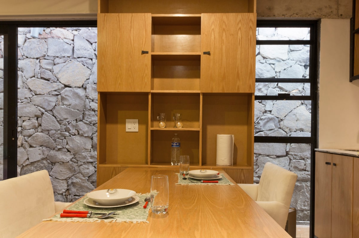 Casa Dos Cuervos en el centro de Querétaro. Disfruta de una experiencia única en nuestra suite diseñada por un estudio de interiorismo. Cuenta con una cama king, aire acondicionado, una cocineta equipada y un baño independiente. En la planta alta encontrarás una suite amplia con cama king, aire acondicionado, televisor y zona de home office. Siempre limpio y listo para recibirte. Vive la ciudad de Querétaro como un local en un espacio exclusivo y confortable.