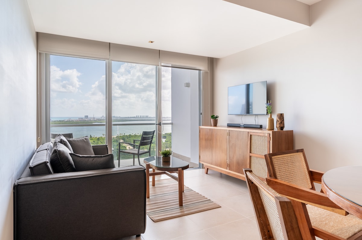 Vive la experiencia de hospedarte en un lujoso departamento de 3 recámaras en Cancún, con espectaculares vistas al parque y la Zona Hotelera. Ideal para familias, grupos o viajes de trabajo, combina elegancia y confort con entretenimiento. Disfruta de una amplia sala con TV de 75” y PlayStation 5, comedor para 6 personas, cocina moderna con barra desayunadora, lavadora y secadora, estacionamiento para 2 autos y una hermosa alberca compartida.