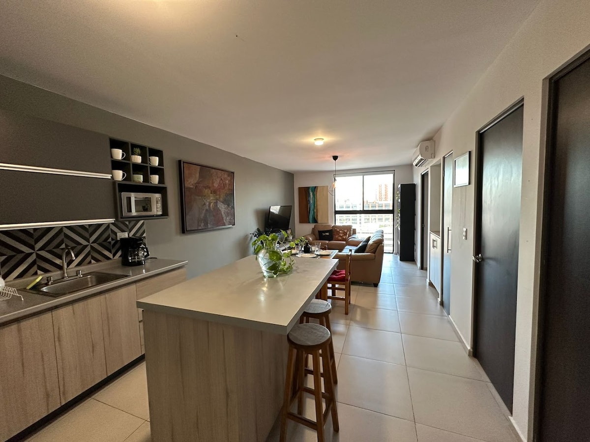 Departamento cómodo y moderno En la zona de NUEVO SUR. cerca de principales puntos de interés. Tec de Monterrey4 min Parque Fundidora 4 min Macro plaza 7 min Valle oriente 15 min En bello centro comercial cuenta con restaurantes, bares y tiendas. Enteregamos factura. El departamento tiene dos recamaras y sala comedor. Se encuentra sobre el centro comercial. También está equipado con escritorio de trabajo, alarma de humo y extinguidor.
