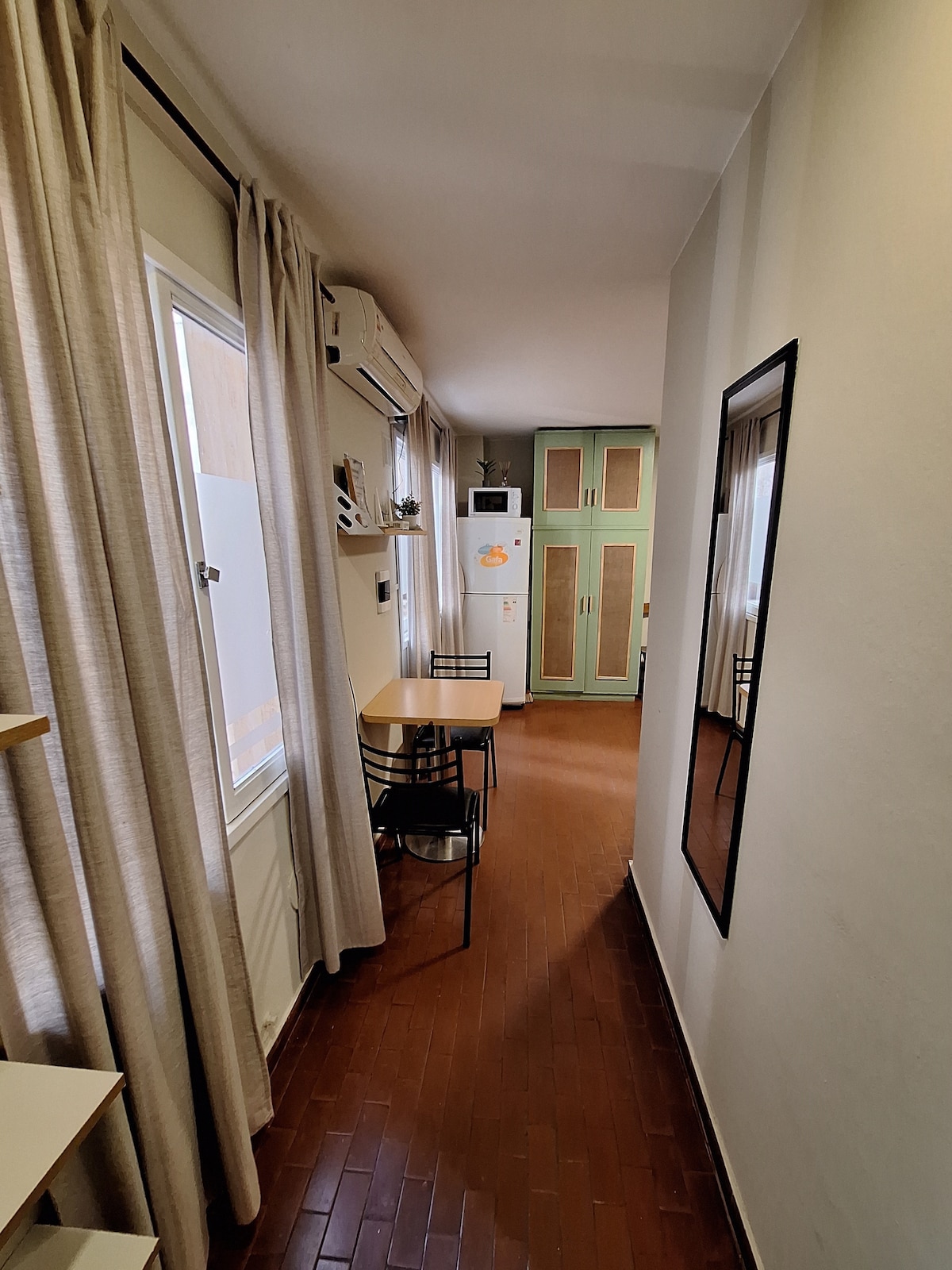 En pleno centro de la ciudad, con el confort necesario para una estadía plena y el mejor descanso. Ubicado en 6to piso, cuenta con sommier de 2 plazas, ropa de cama, toallas y toallones, aire acondicionado en el comedor y en la habitación, dos TV de 43", cable, Wi-Fi, heladera, tostador, cafetera y pava eléctrica, cocina bien equipada y vajilla. El balcón contiguo al dormitorio equipado con dos sillas y una mesita, es ideal para terminar el día ya que es una zona tranquila.