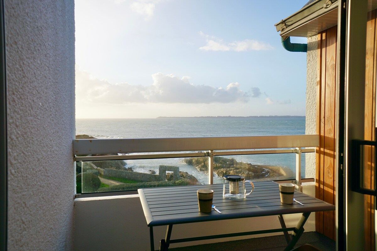 Bienvenido a mi apartamento con unas magníficas vistas al mar. Consta de una gran terraza, una agradable sala de estar luminosa, una cocina totalmente equipada y un dormitorio con una cama de 160 cm. El apartamento está situado en Lomener, en el primer piso de un condominio tranquilo y tiene una plaza de aparcamiento privado. La playa y los senderos costeros están al pie del edificio, al igual que las tiendas y los restaurantes. ¡Posibilidad de poner bicicletas y raquetas de pádel a disposición!