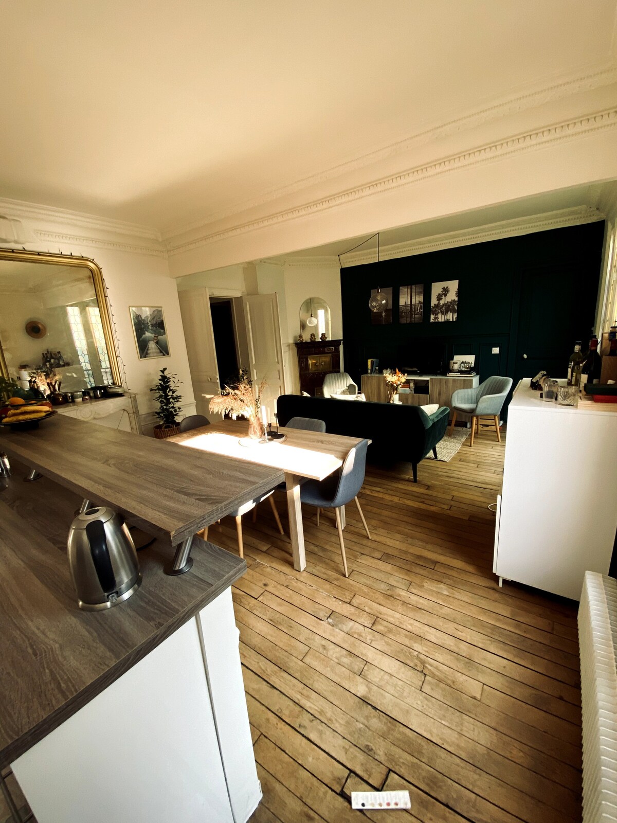 En el patio interior, este tranquilo apartamento totalmente renovado con una decoración contemporánea mezclada con muebles vintage ofrece 2 dormitorios grandes, una sala de estar muy grande con una mesa para 8 personas, una acogedora sala de estar y un baño con bañera. Muy equipado, te fascinará por su estilo y sus espacios. Centro de París, gran accesibilidad a todos los monumentos, a 2 pasos de las principales estaciones de tren.