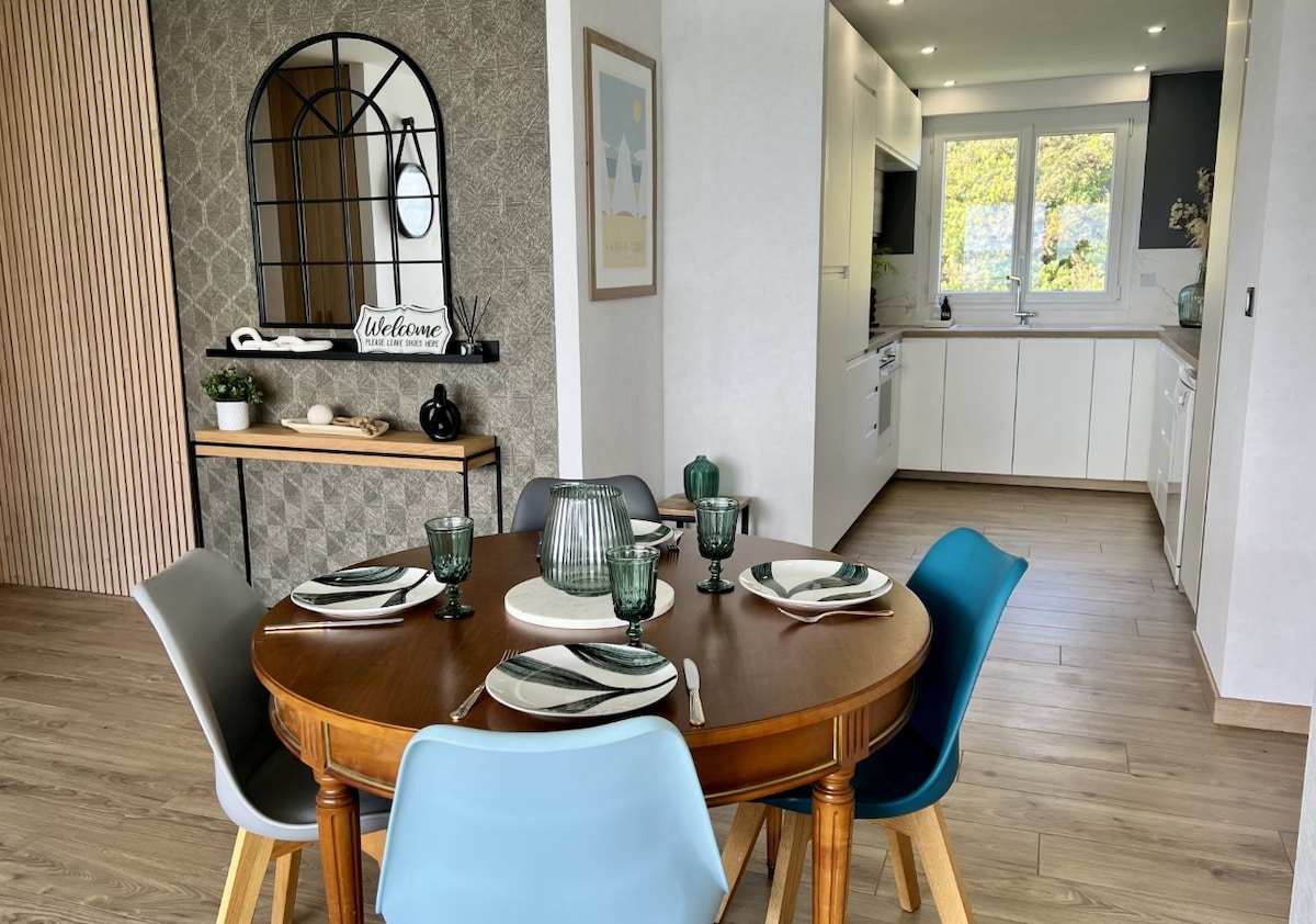 Book now for the perfect vacation! Completely remodeled, well-insulated thermally and acoustically, with high-end appliances. 4 Bed and 3.5 Baths (w/bathtub) - 5 beds (1 King /2 Queen/2 Singles) perfect for 8 guests. Located in the best place, close to the beach and town but in a quiet setting with lovely walks and cycle paths. -Natural Beach: 600m -Dinard: A stone's throw away 5-7 min car, bus or bicycle -St Malo: A short drive 15-20 minutes by car, bus -Mount Saint Michel: 50 minutes’ drive