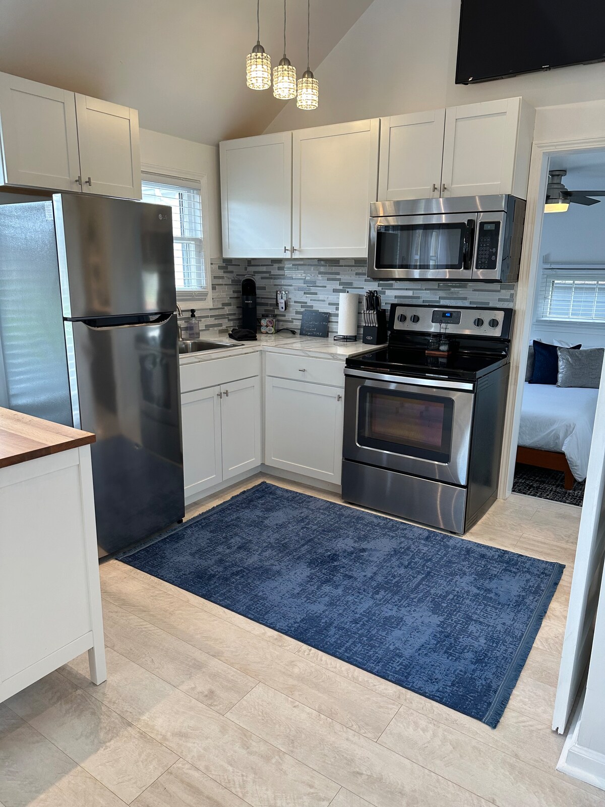 Amish Paradise tiene un concepto de planta abierta con la sala de estar, el comedor y la cocina en el primer piso. Hay 3 dormitorios en el segundo piso. Subiendo las escaleras tenemos una vista lateral que mira por una ventana arque da al bosque. Sin embargo, nuestra parte favorita de esta casa son las vistas desde la cubierta envolvente. ¡Tiene una vista espectacular de nuestra propiedad y más allá, hasta el parque Marti! ¿Mencioné que esta casa fue una vez una verdadera casa Amish?😉